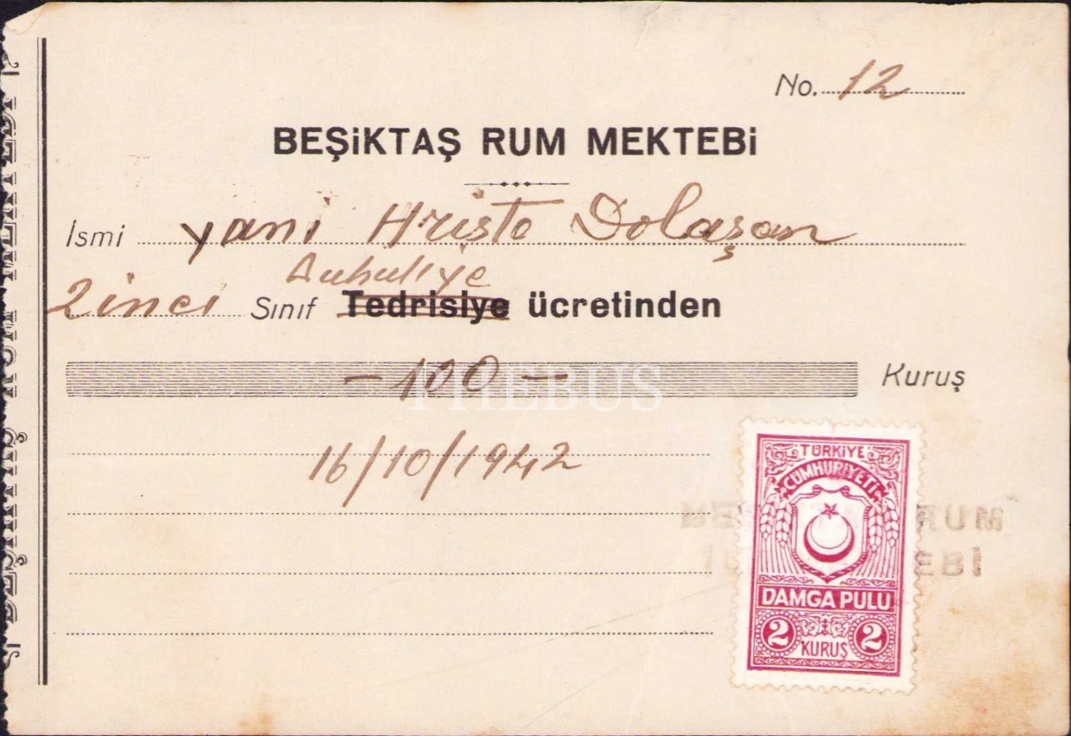 Beşiktaş Rum Mektebi antetli, pullu makbuz, 1942 tarihli, 13x9 cm