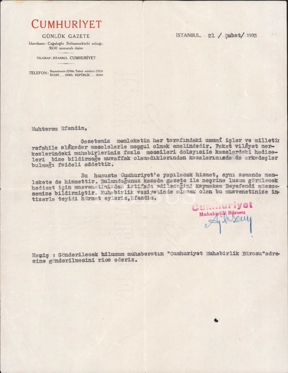 Cumhuriyet gazetesinin kazalarda muhabir arayışına dair 1933 tarihli evrak, 23x30 cm