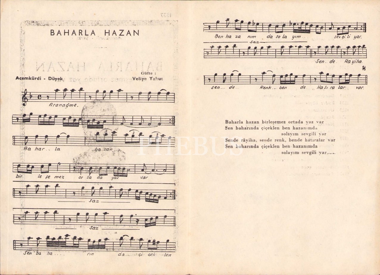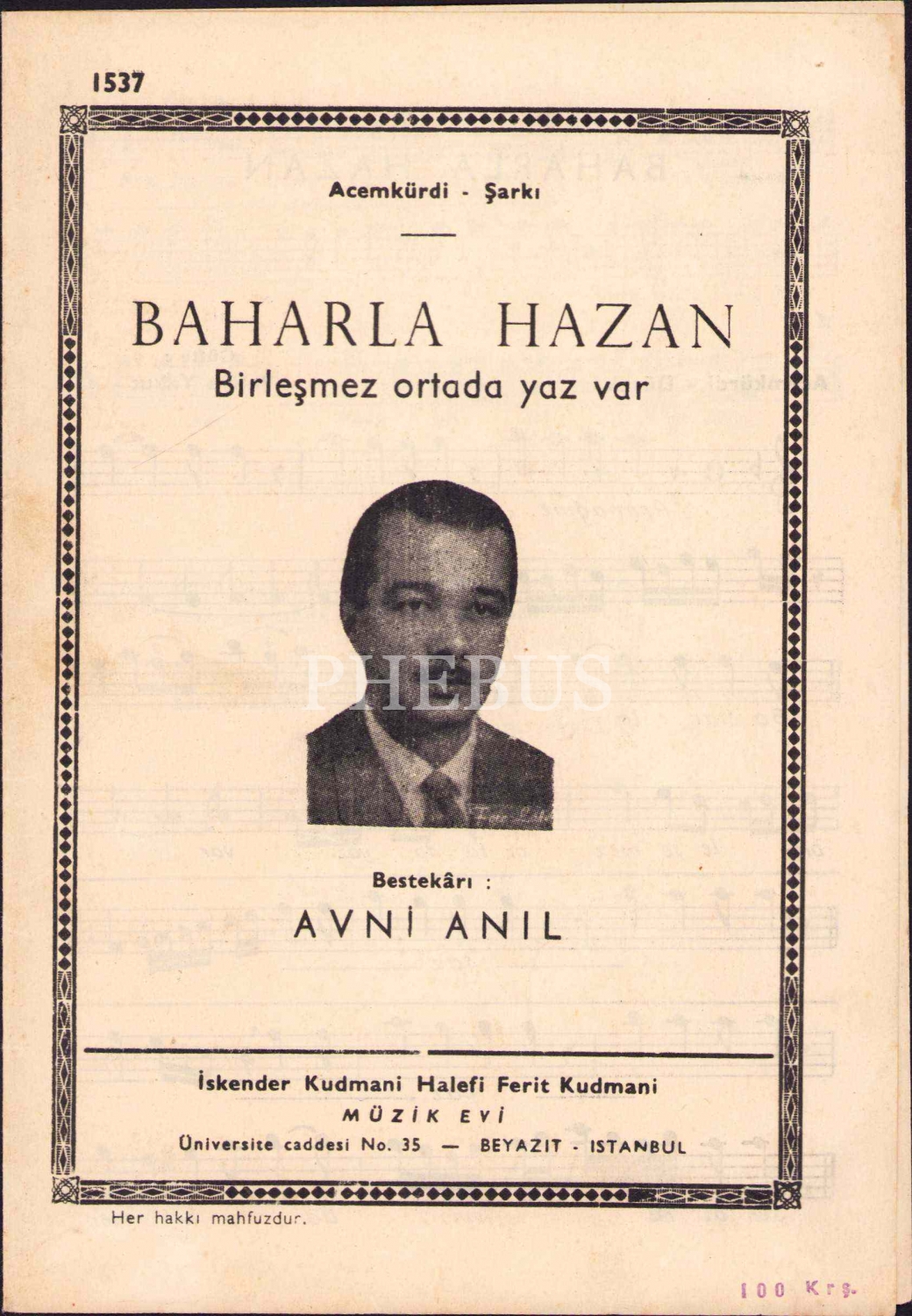 Acemkürdi - Şarkı ''Baharla Hazan Birleşmez Ortada Yaz Var", Bestekarı: Avni Anıl, İskender Kudmani Halefi Ferit Kudmani Müzik Evi - Beyazıt / İstanbul, 2 sayfa, 15x21 cm