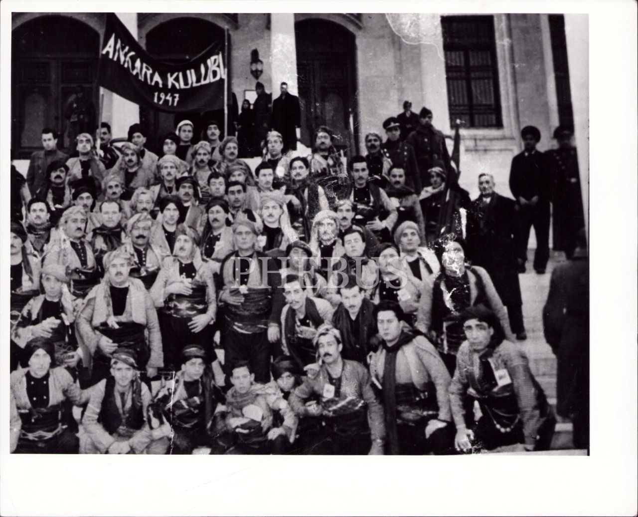 Ankara Kulübü 1947 yazılı pankart önünde müsamere kostümlü topluluk, 26x21 cm