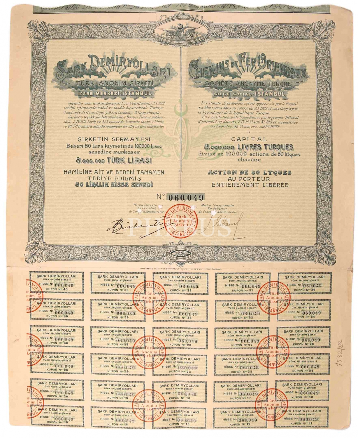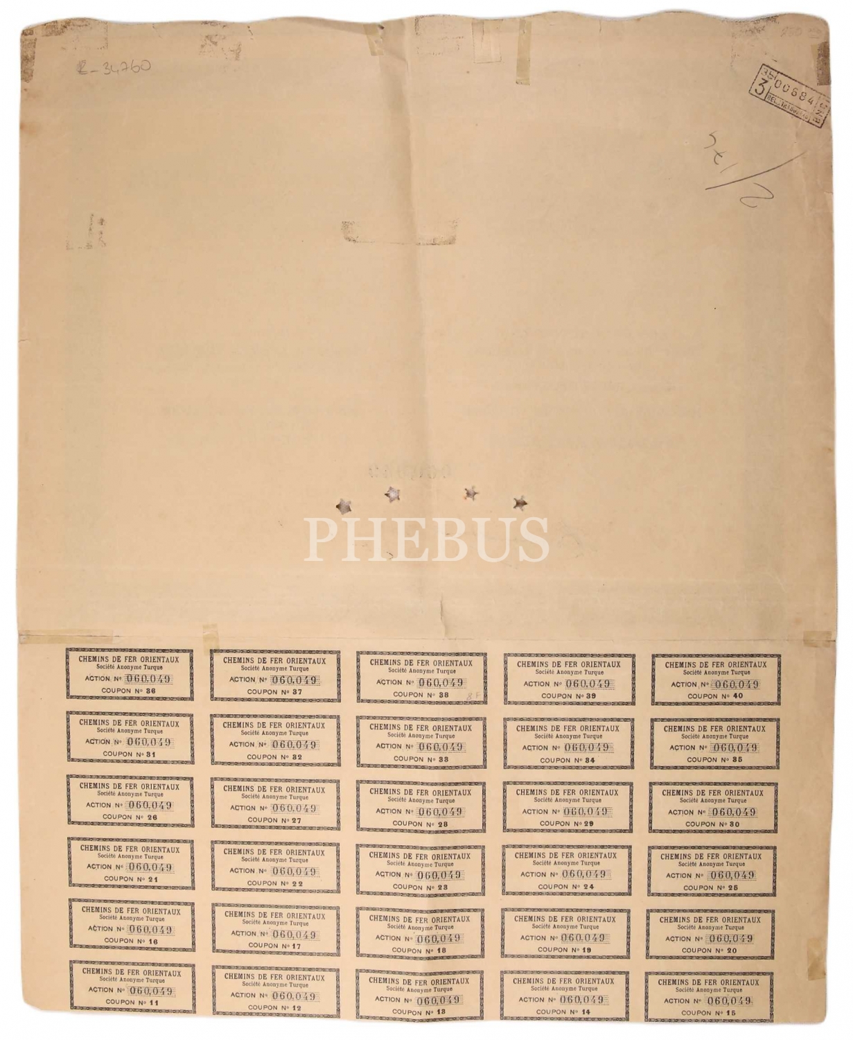 Şark Demiryolları Türk Anonim Şirketi - Türkçe ve Fransızca hisse senedi, 36x44 cm