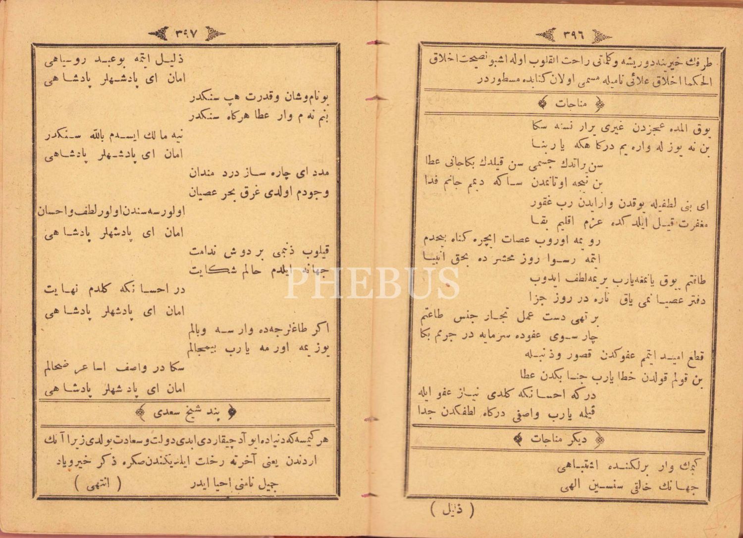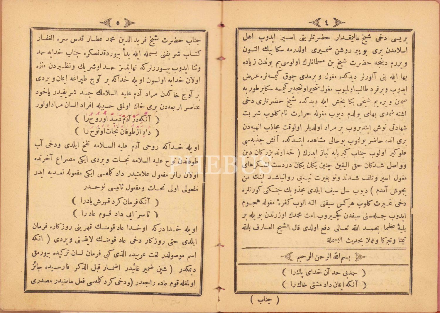 Mahazar, Feridüddin Attar, çev., Hafız Mehmed Murad, Şirketi Sahafiye-i Osmaniye Matbaası, 1311, Farsça ve Osmanlıca tercümesi, 400 sayfa, 12x18cm