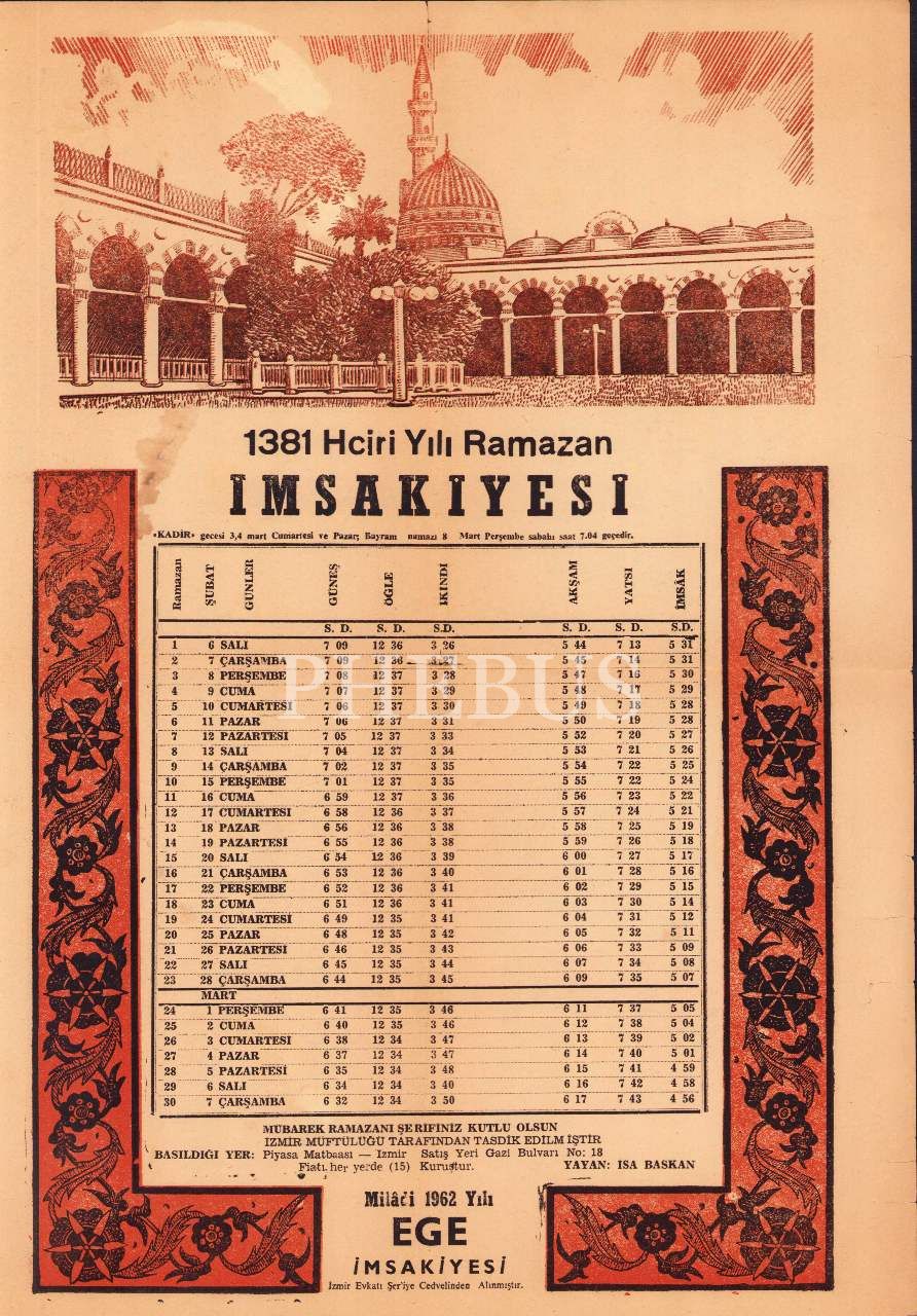 1381 Hicri Ramazan İmsakiyesi (Miladi 1962 Yılı Ege İmsakiyesi), İzmir Evkaf-ı Şer'iye Cedvelinden Alınmıştır, 29x42 cm, kenarları haliyle