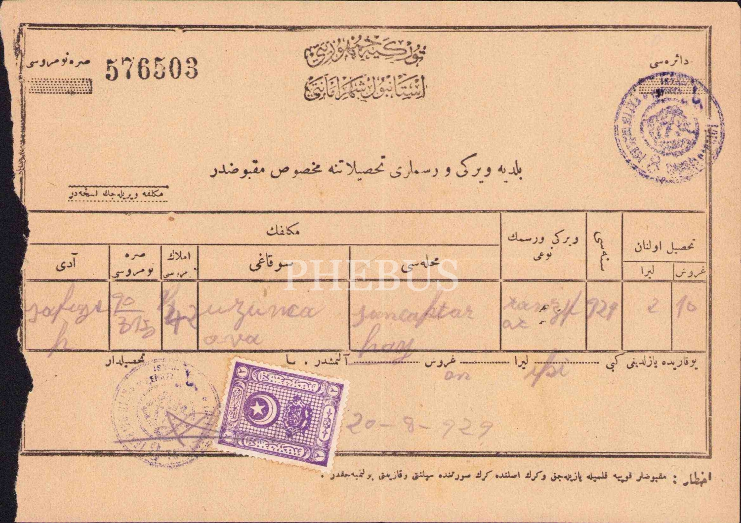 Osmanlıca belediye makbuzu, İstanbul, 1929, 14x19 cm
