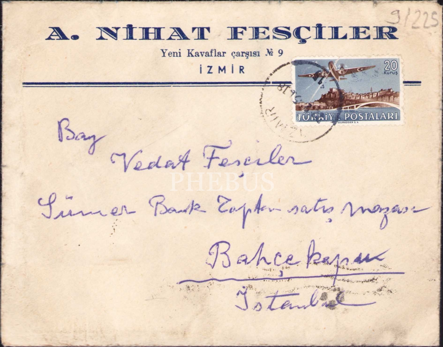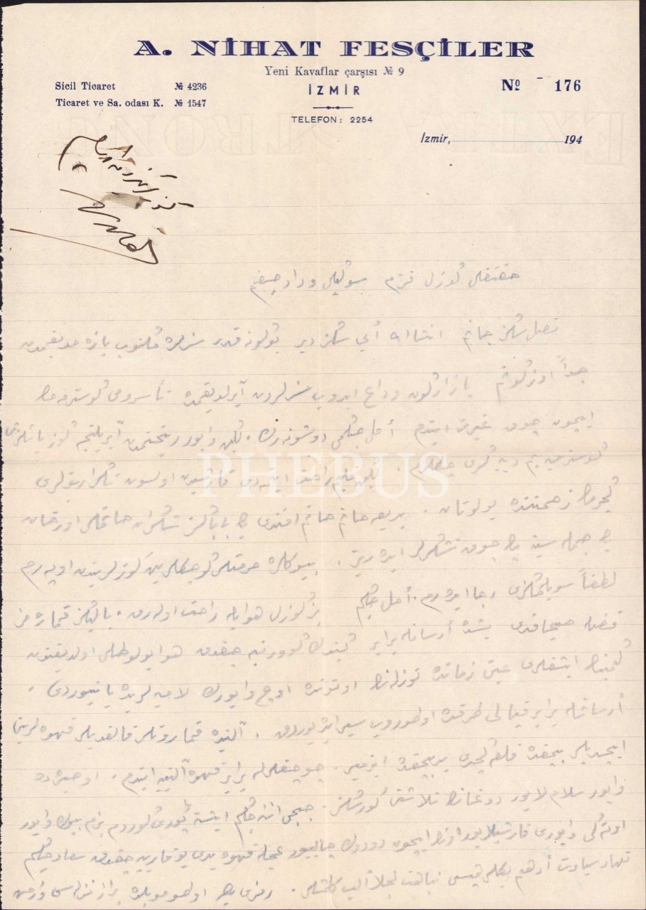 A. Nihat Fesçiler - Yeni Kavaflar Çarşısı İzmir antetli zarf ve aynı antete sahip kağıt üzerine Osmanlıca mektup, 17x13 cm