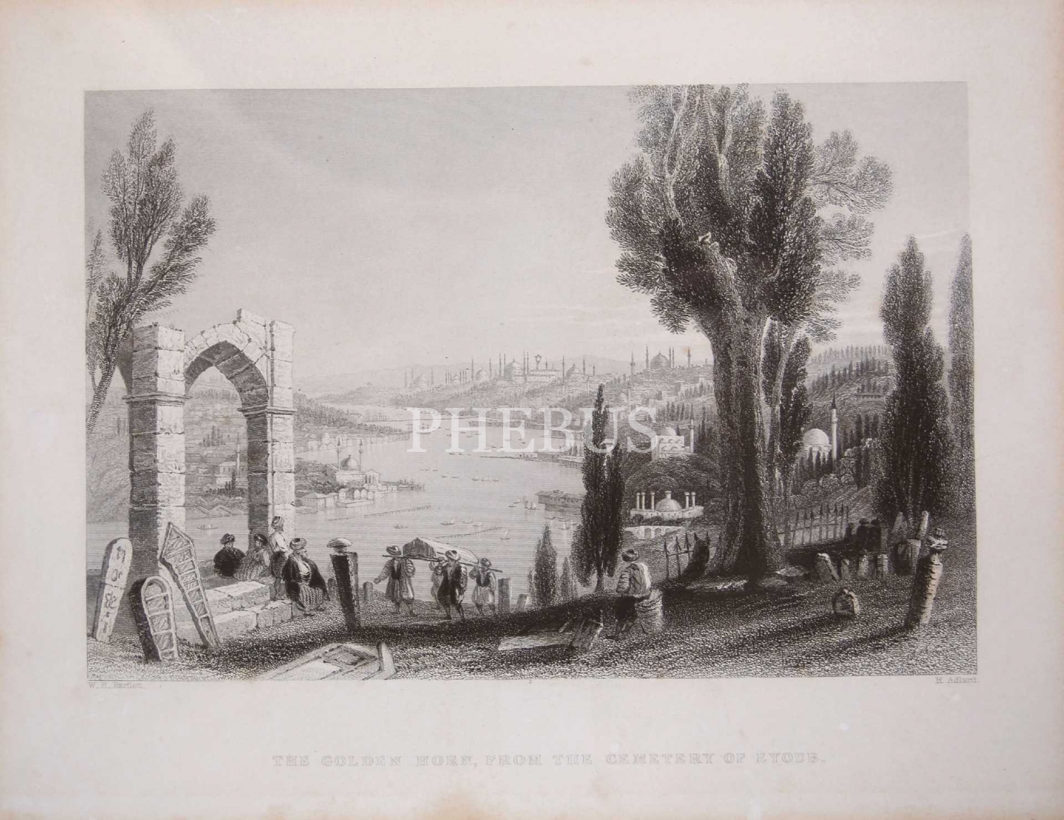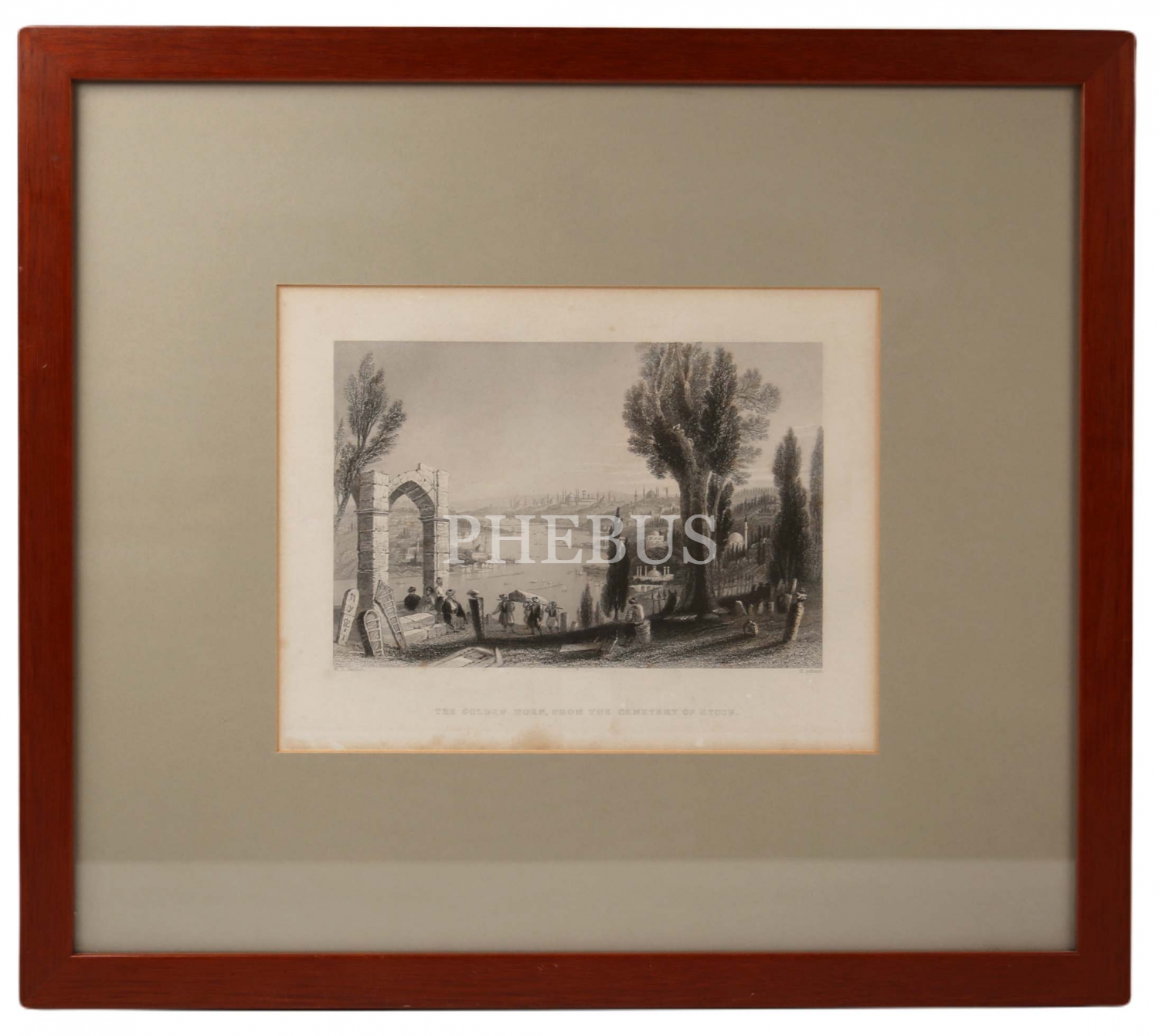 Eyüp Mezarlığı'ndan Haliç'in resmedildiği Fransız gravür, paspartulu ve çerçeveli, 23x15 cm