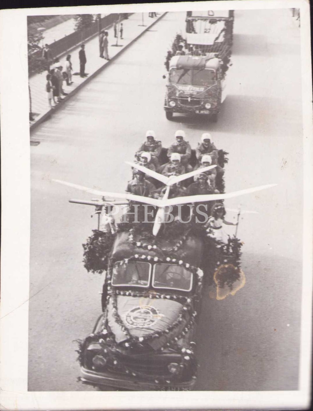 Türk Hava Kurumu'nun geçit töreni için süslenmiş arabası ve havacılar seyir halinde, 9x12 cm