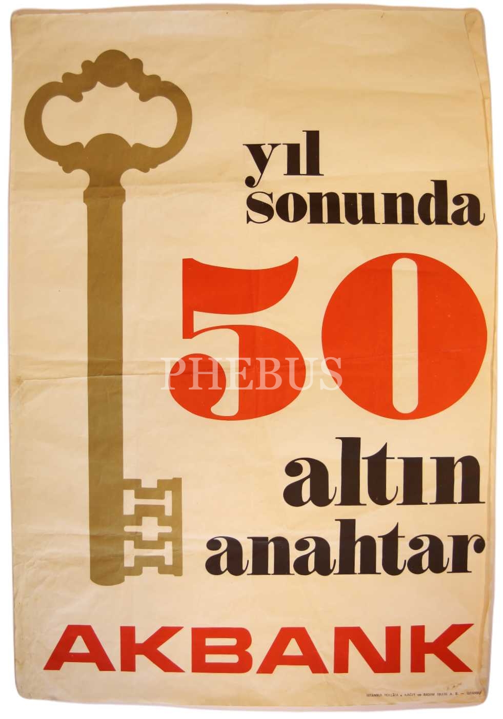 Yıl Sonunda 50 Altın Anahtar yazılı Akbank afişi, 100x72 cm