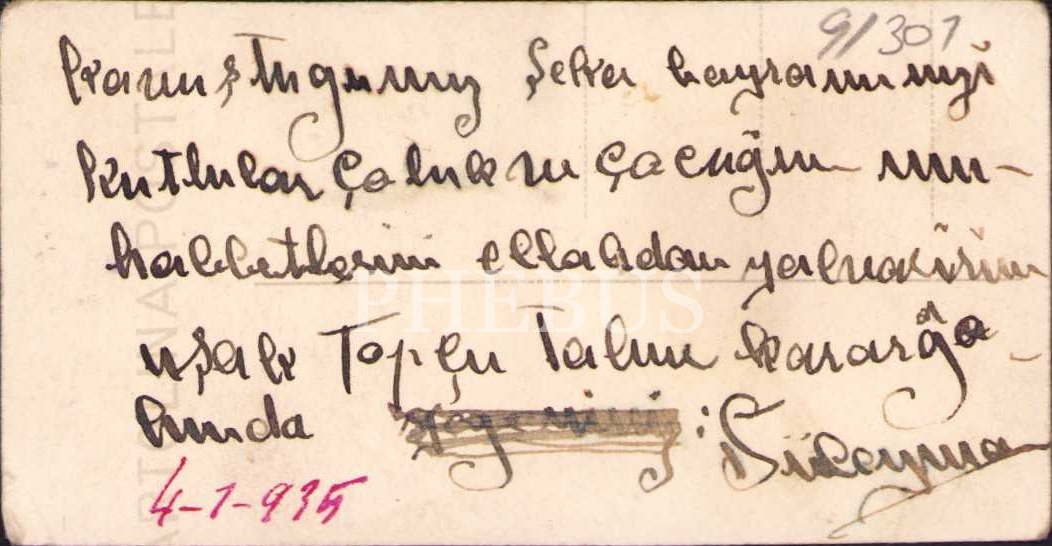 Arkasında 1935 tarihli bir bayram tebriğiyle fotoğraf, 4x9 cm