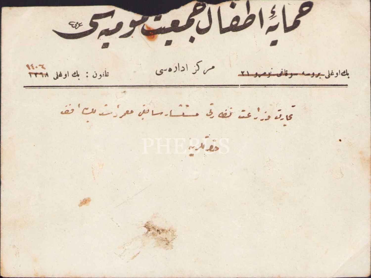 Osmanlıca Himaye-i Etfal Cemiyet-i Umumiyesi antetli zarf, haliyle, 1306, 11x15 cm