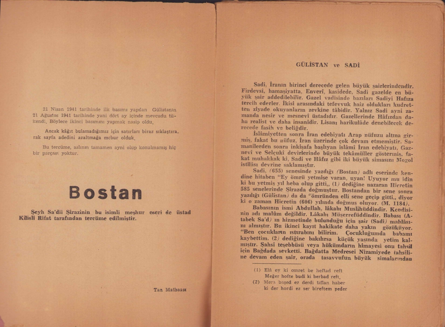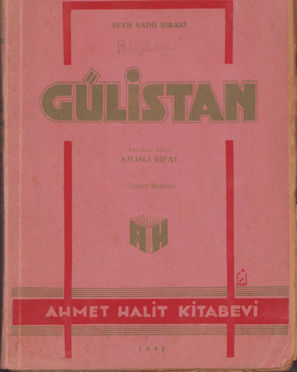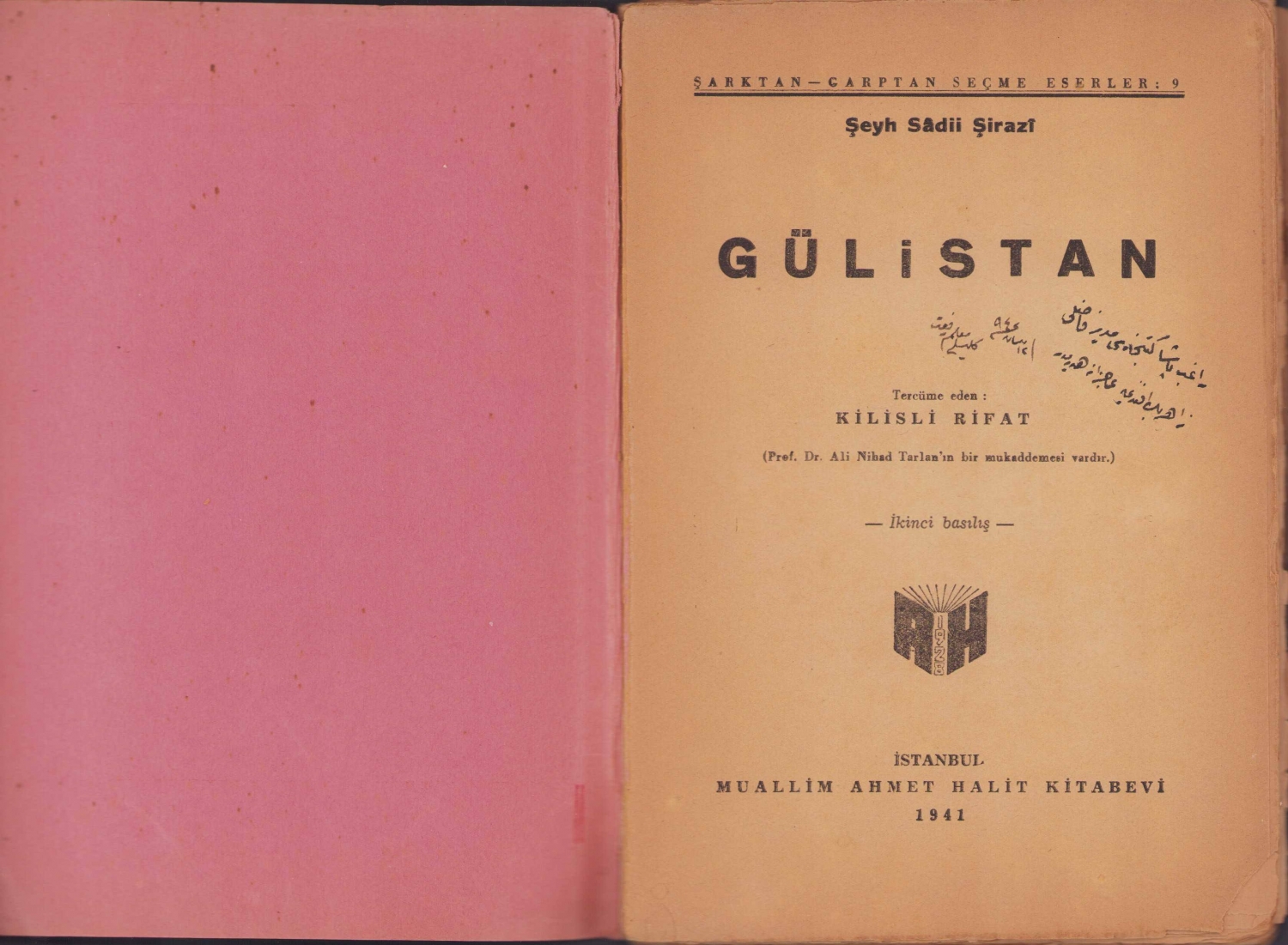 Gülistan - Şarktan - Garptan Seçme Eserler: 9, Şeyh Sadi Şirazi, çev., Kilisli Rıfat, ikinci baskı, Tan Matbaası, İstanbul, 1941, çevirmeninden imzalı, 155 sayfa, 14x20cm