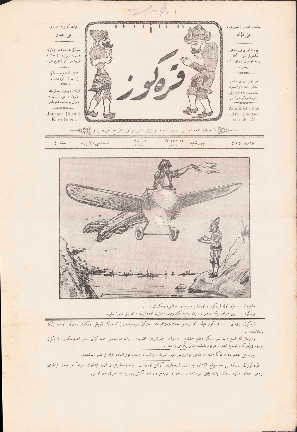 Karagöz Mizah Gazetesi, sahibi Ali Fuat, 405.sayı, 1328, Osmanlıca, Hacivat ve Karagöz görselli diyalog kapak, uçak detaylı, 4 sayfa, 28x41cm