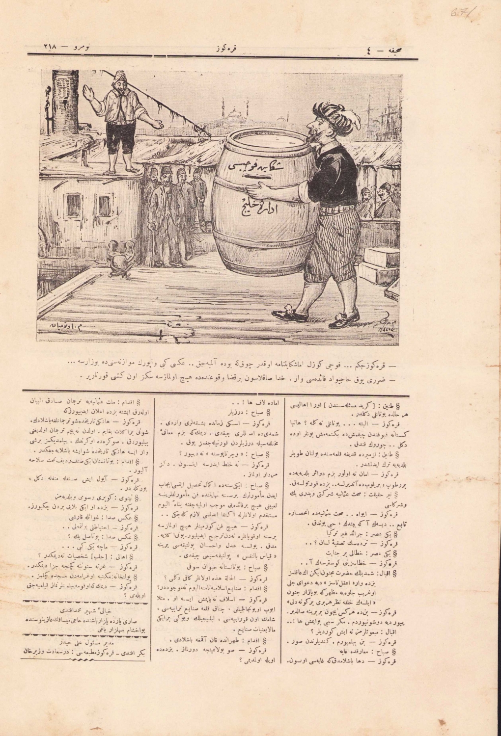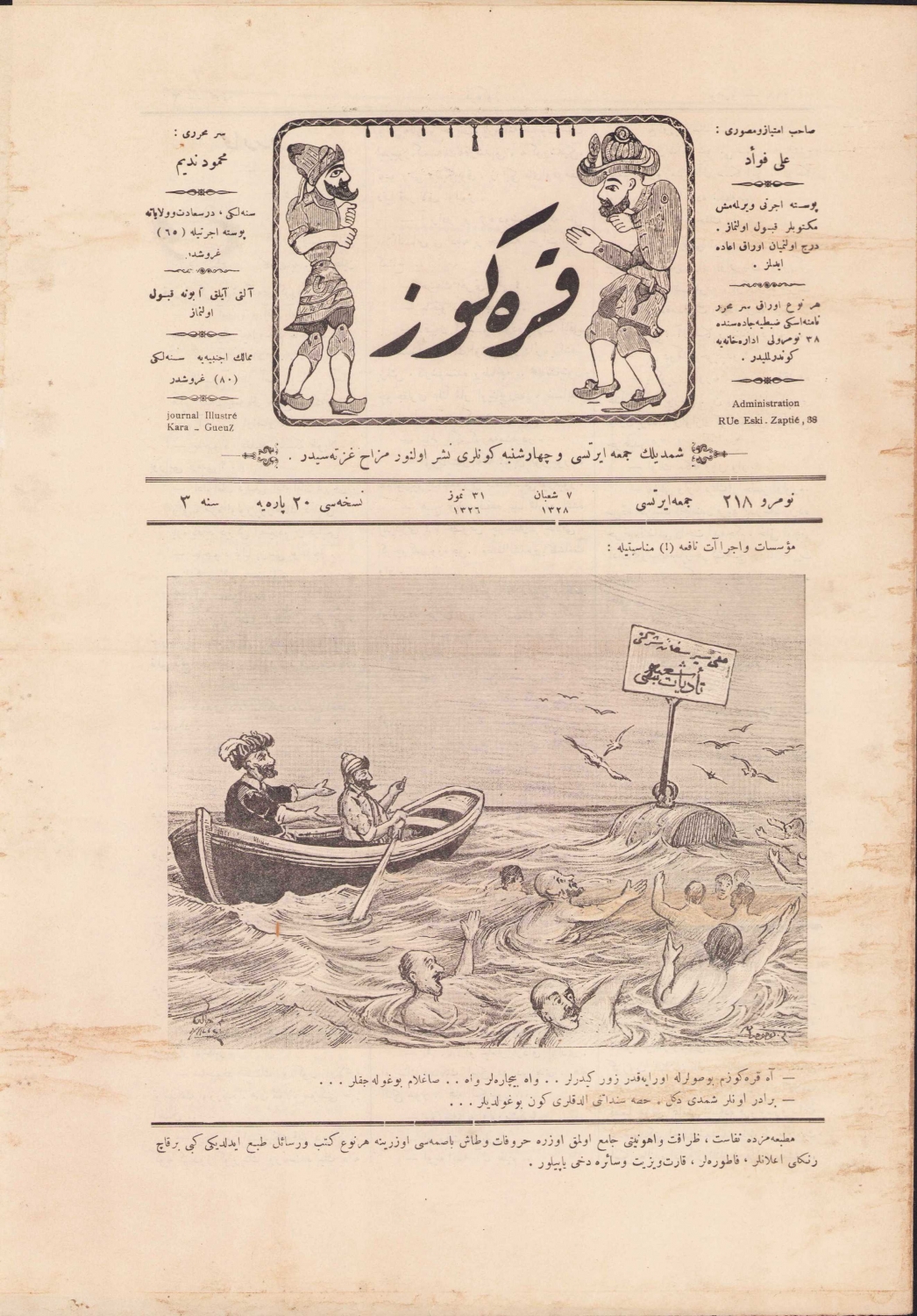 Karagöz Mizah Gazetesi, sahibi Ali Fuat, 218.sayı, 1326, Osmanlıca, görselli kapak, 4 sayfa, 28x41cm