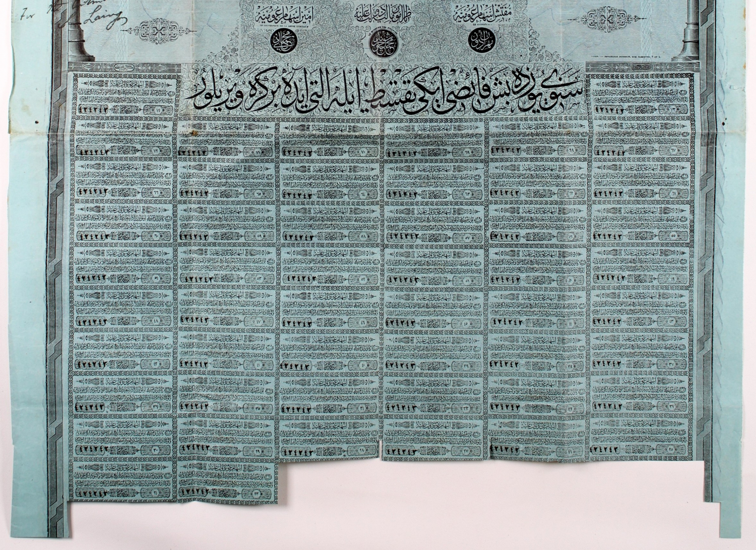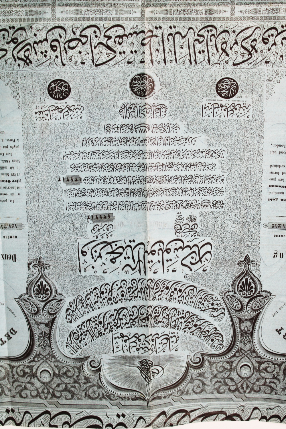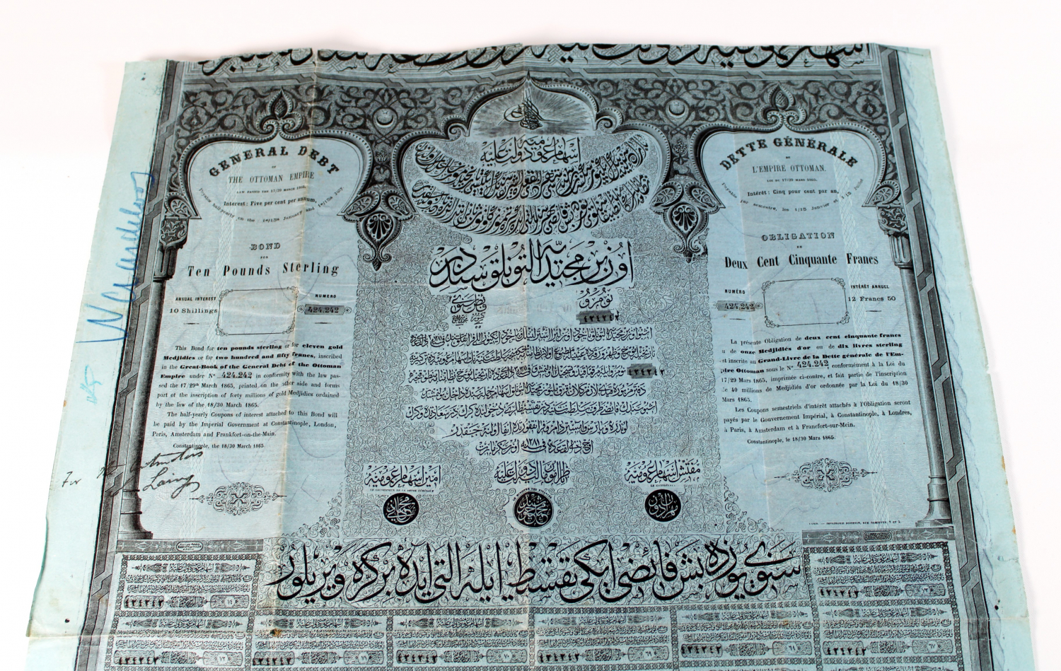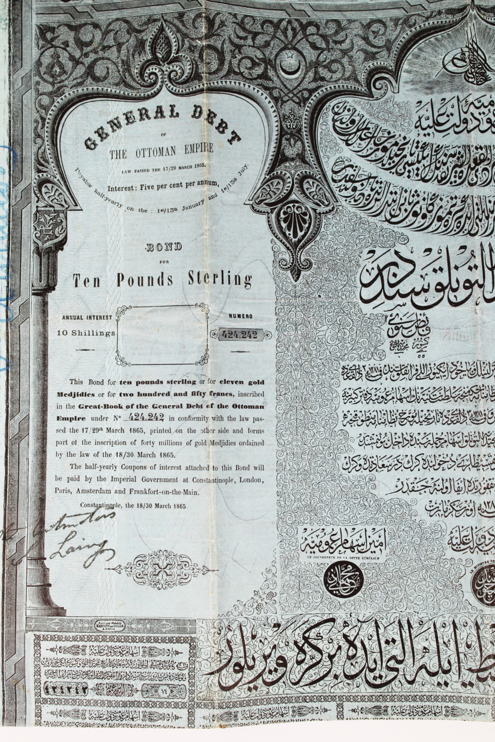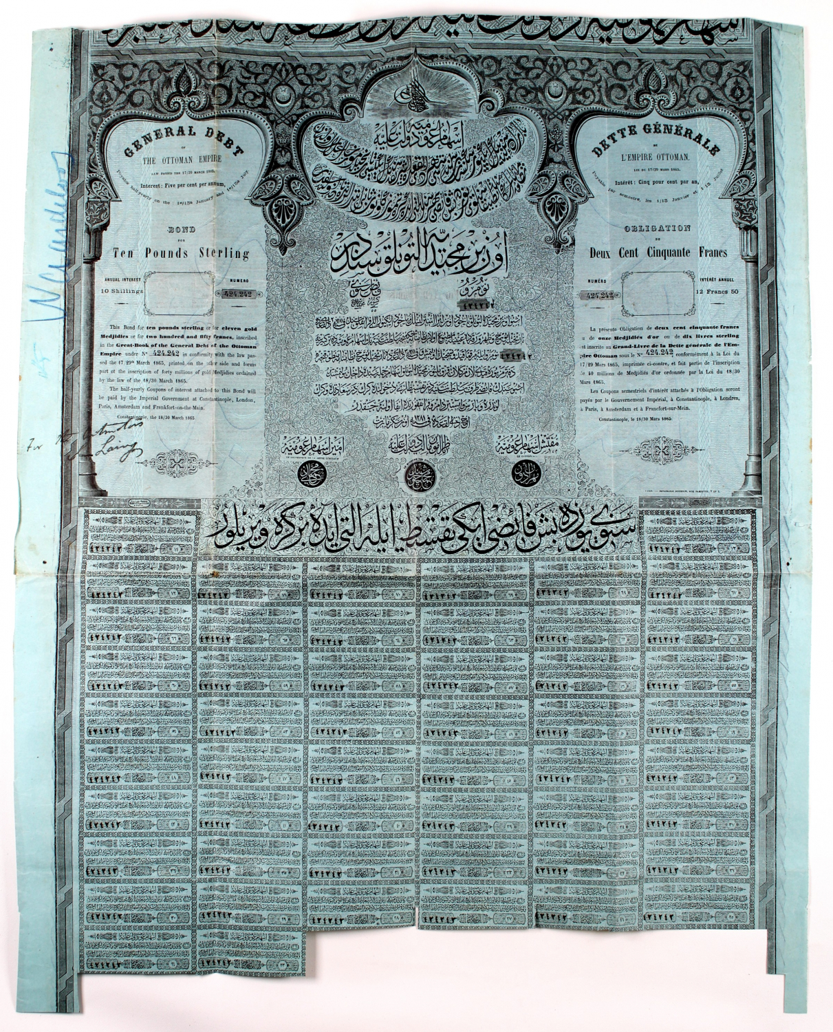 Esham-ı Umumiye Devleti Aliye hisse senedi, ederi 10 Sterlin, Osmanlıca-İngilizce-Fransızca 3 dilde, 1865 tarihli