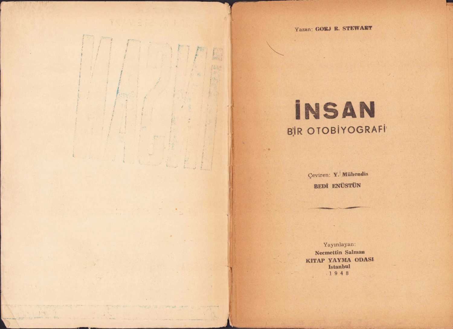 İnsan Bir Otobiyografi, Corj R. Stewart, çev., Bedi Enüstün, İstanbul, 1947, 48 sayfa, 15x21cm