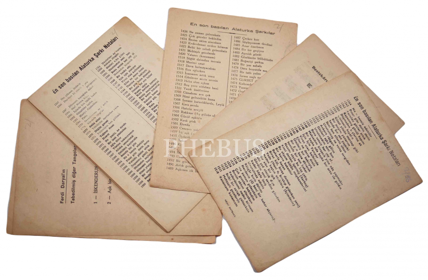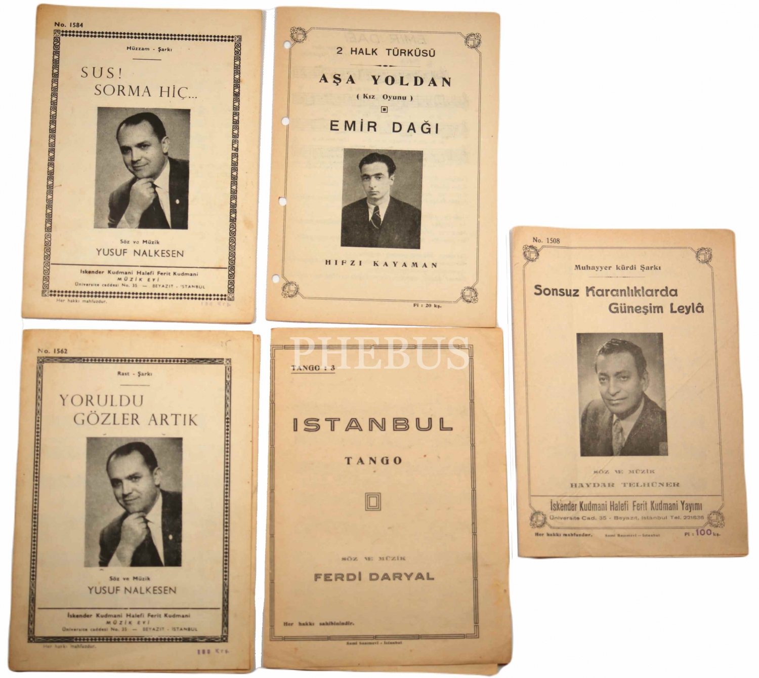 Nota yayıncısı İskender Kudmani'den Yusuf Nalkesen, Hıfzı Kayaman, Ferdi Daryal ve Haydar Telhüner'e ait 5 adet nota lotu, 14x20 cm