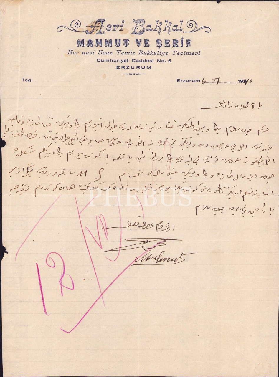 Asri Bakkal Mahmut ve Şerif antetli, sipariş konulu mektup, Erzurum 1940, 21x28 cm
