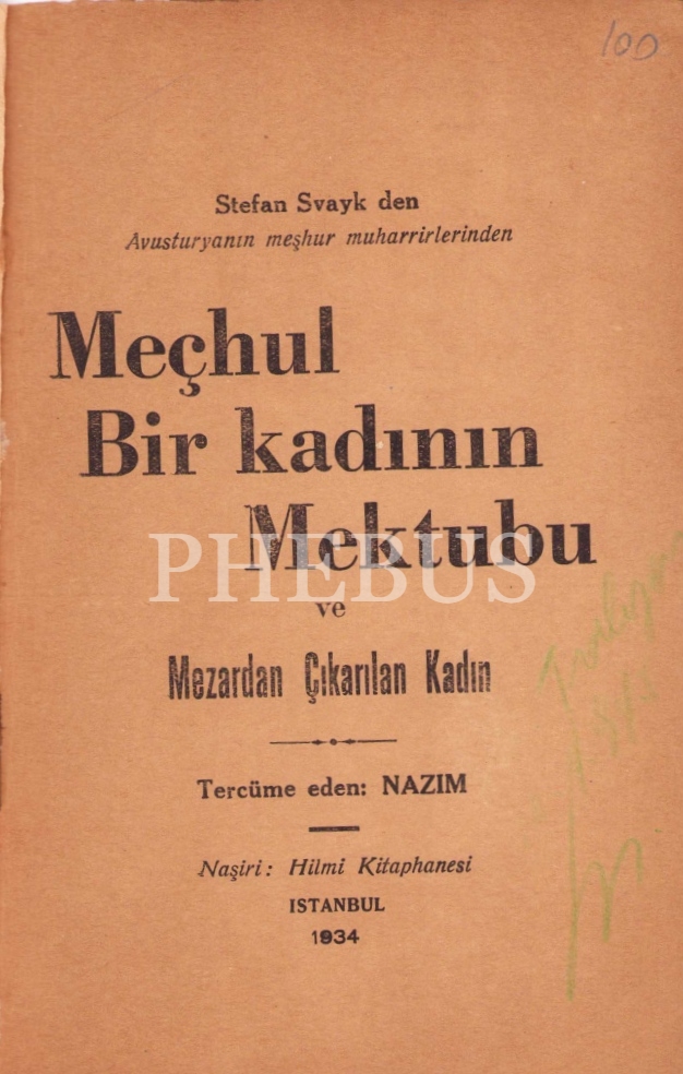 Meçhul Bir Kadının Mektubu ve Mezardan Çıkarılan Kadın, Stefan Şvayk [Zweig], Hilmi Kitaphanesi, İstanbul 1934, 95 syf., 12x18 cm