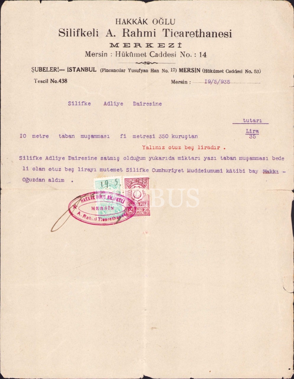 Hakkak Oğlu Silifkeli A. Rahmi Ticarethanesi antetli alışveriş belgesi, Mersin 1935, 23x29 cm, haliyle