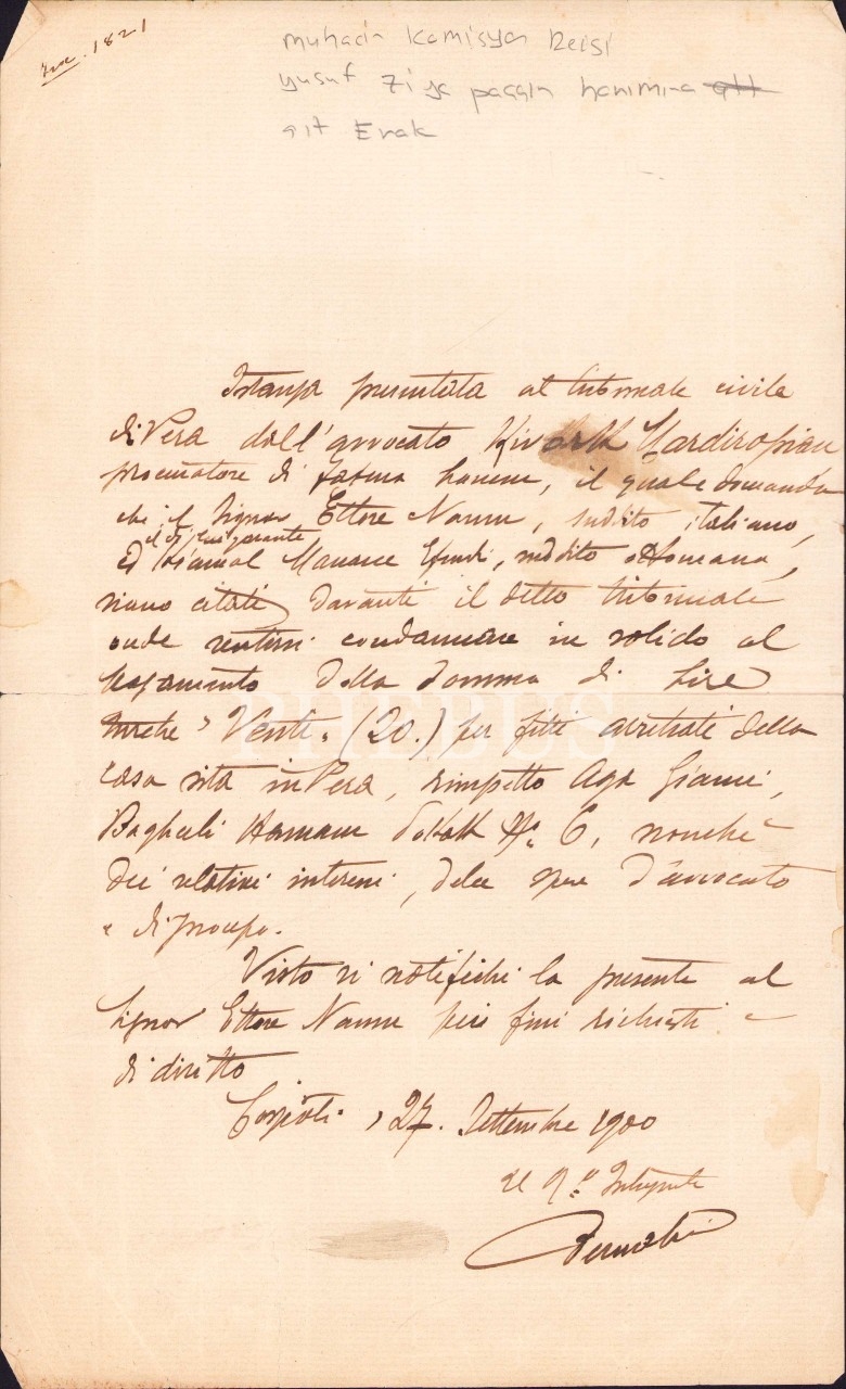Mülga Muhacir Komisyonu Reisi Yusuf Rıza Paşa'nın ailesine ait alacağın İtalyalı kiracıdan alınmasına dair dava dilekçesi