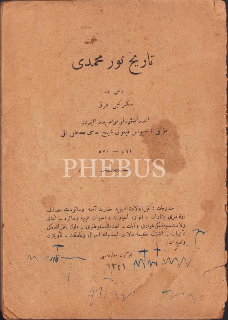 Osmanlıca Tarih-i Nur-i Muhammedi, Sivas Mebusu Şeyh Hacı Mustafa Taki, Öğüd Matbaası, 1341, 44 syf., 14x19 cm, haliyle