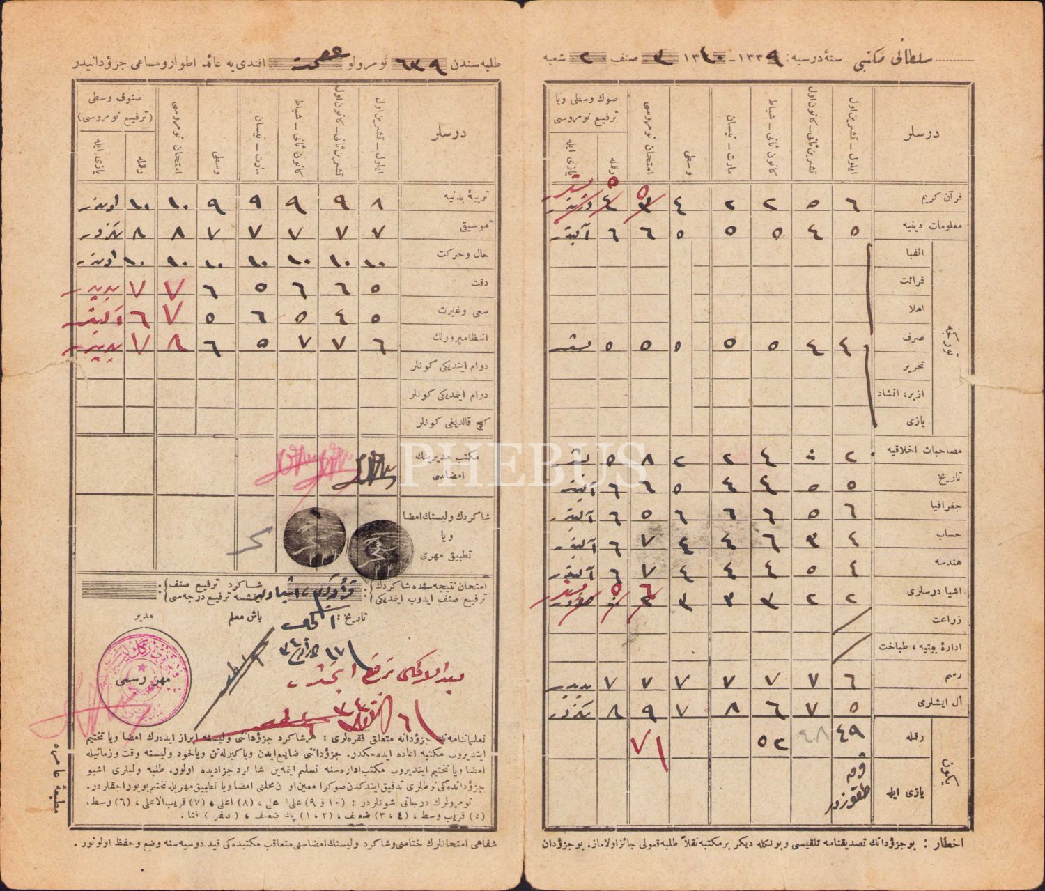 Osmanlıca öğrenci karnesi, 1340, 21x25 cm, kenarları haliyle