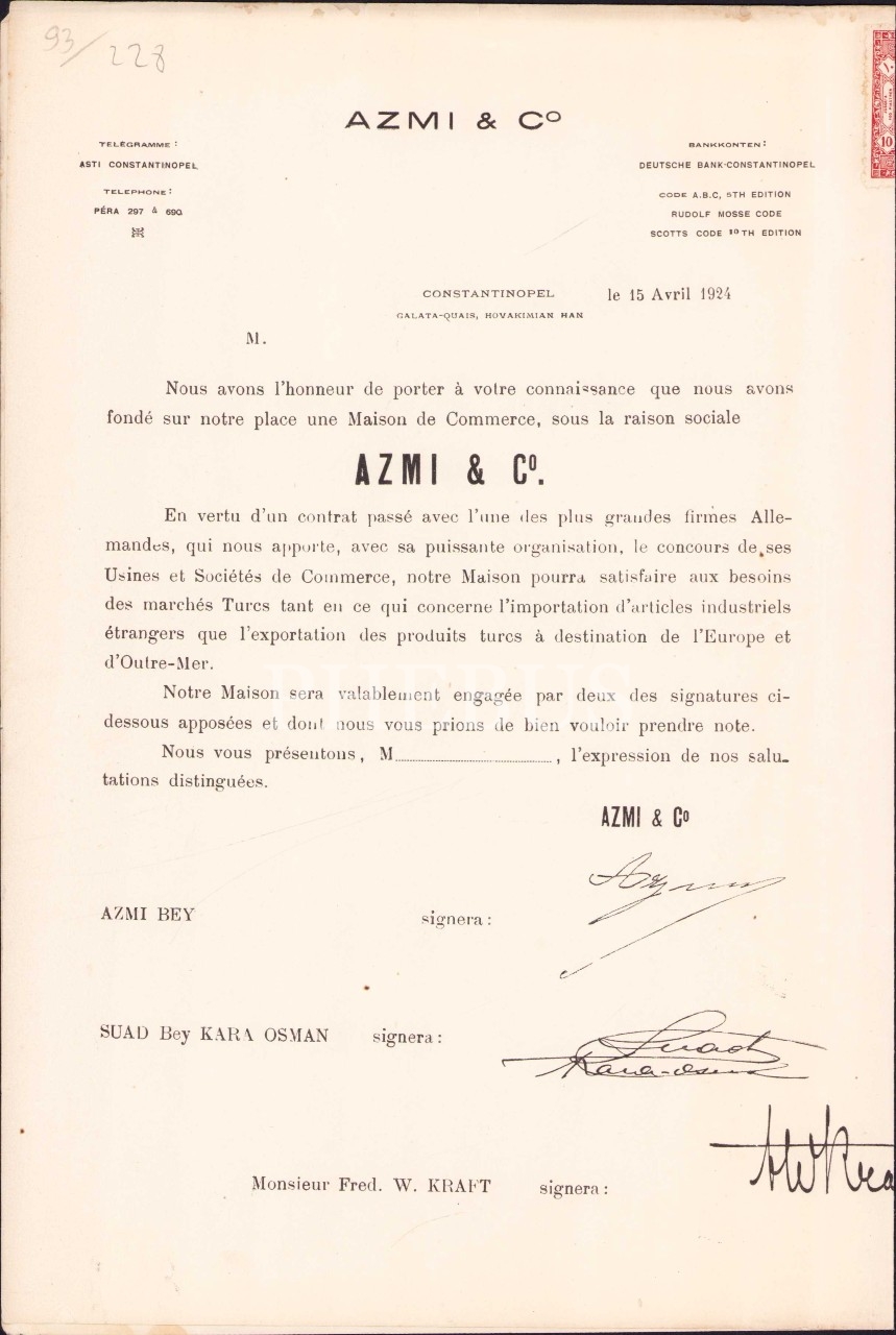 Osmanlıca-Fransızca Azmi ve Şürekası antetli imza sirküleri, 20x30 cm