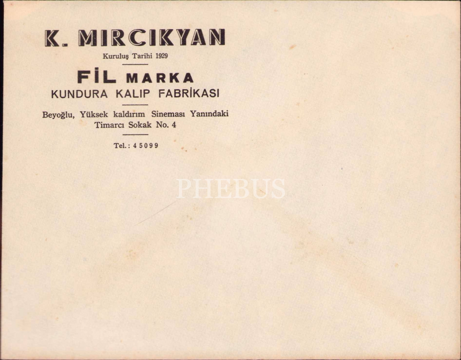 K. Mırcıkyan, Fil Marka Kundura Kalıp Fabrikası antetli boş zarf, 16x12 cm