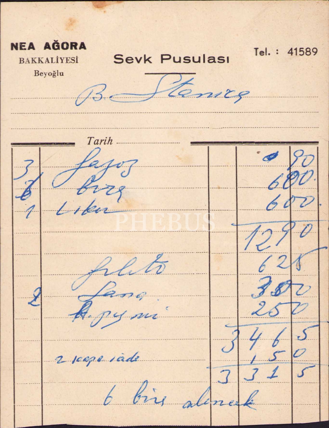 Beyoğlu Nea Agora Bakkaliyesi sevk pusulası, 11x15 cm