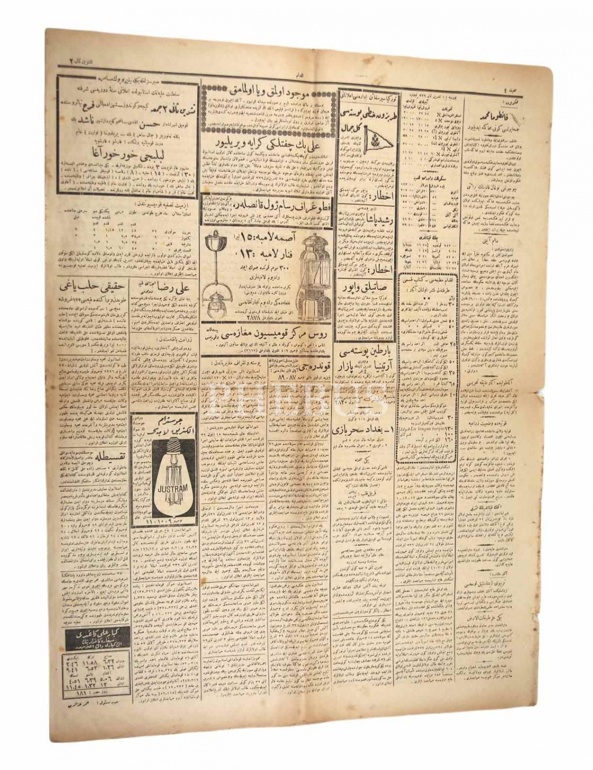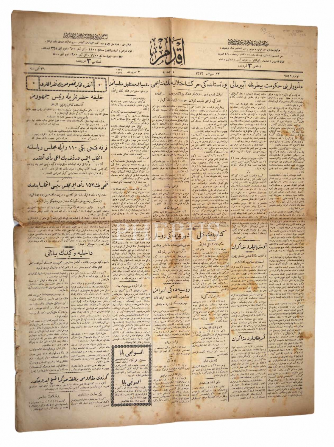 Osmanlıca İkdam gazetesi, 1923, 4 syf., 47x62 cm