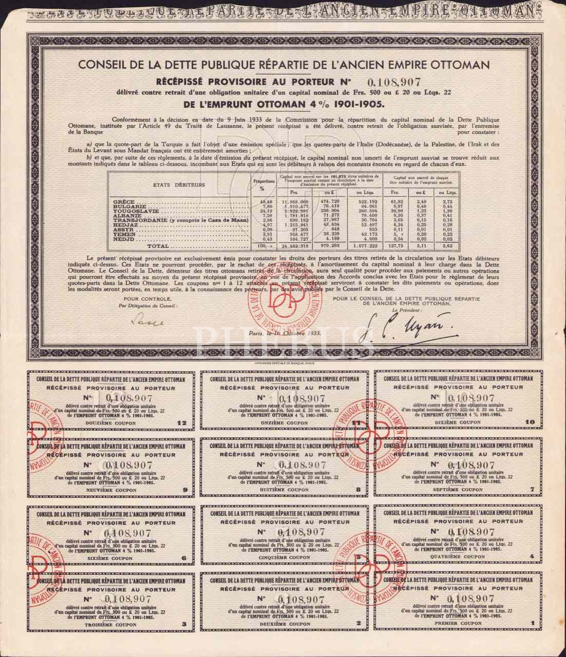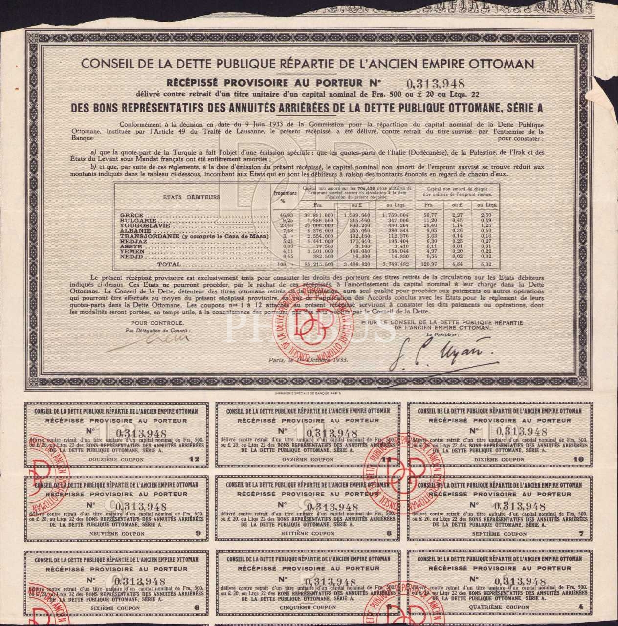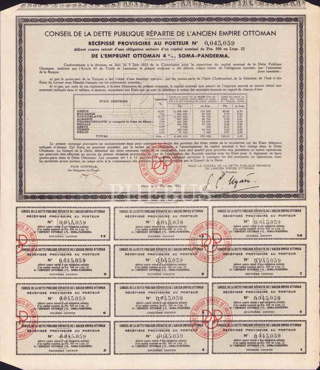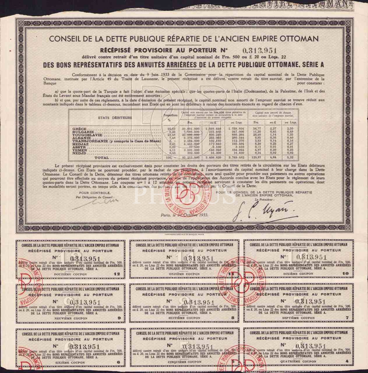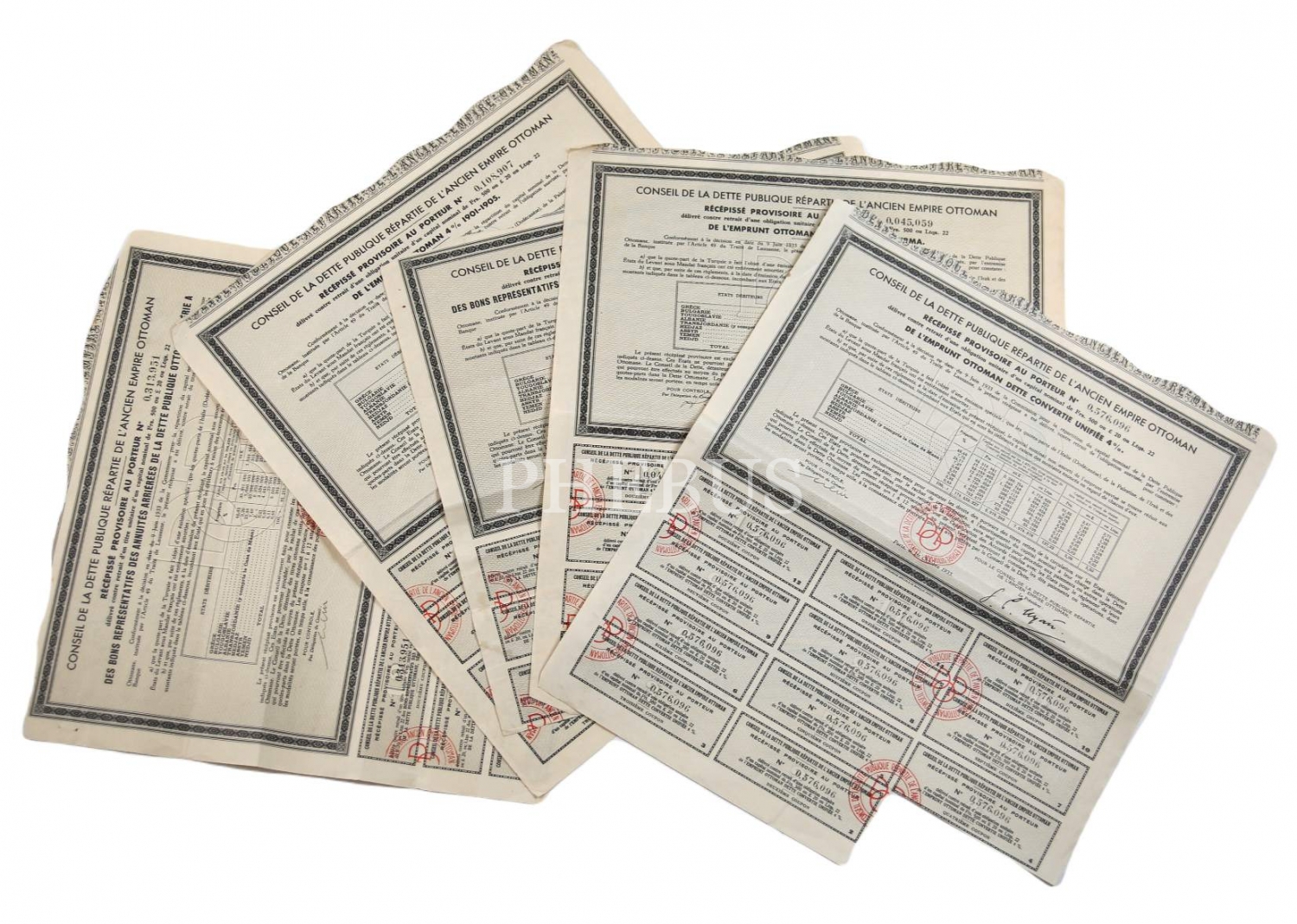Conseil De La Dette Publique Repartie De L'Ancien Empire Ottoman 5 adet hisse senedi, 27x32 cm