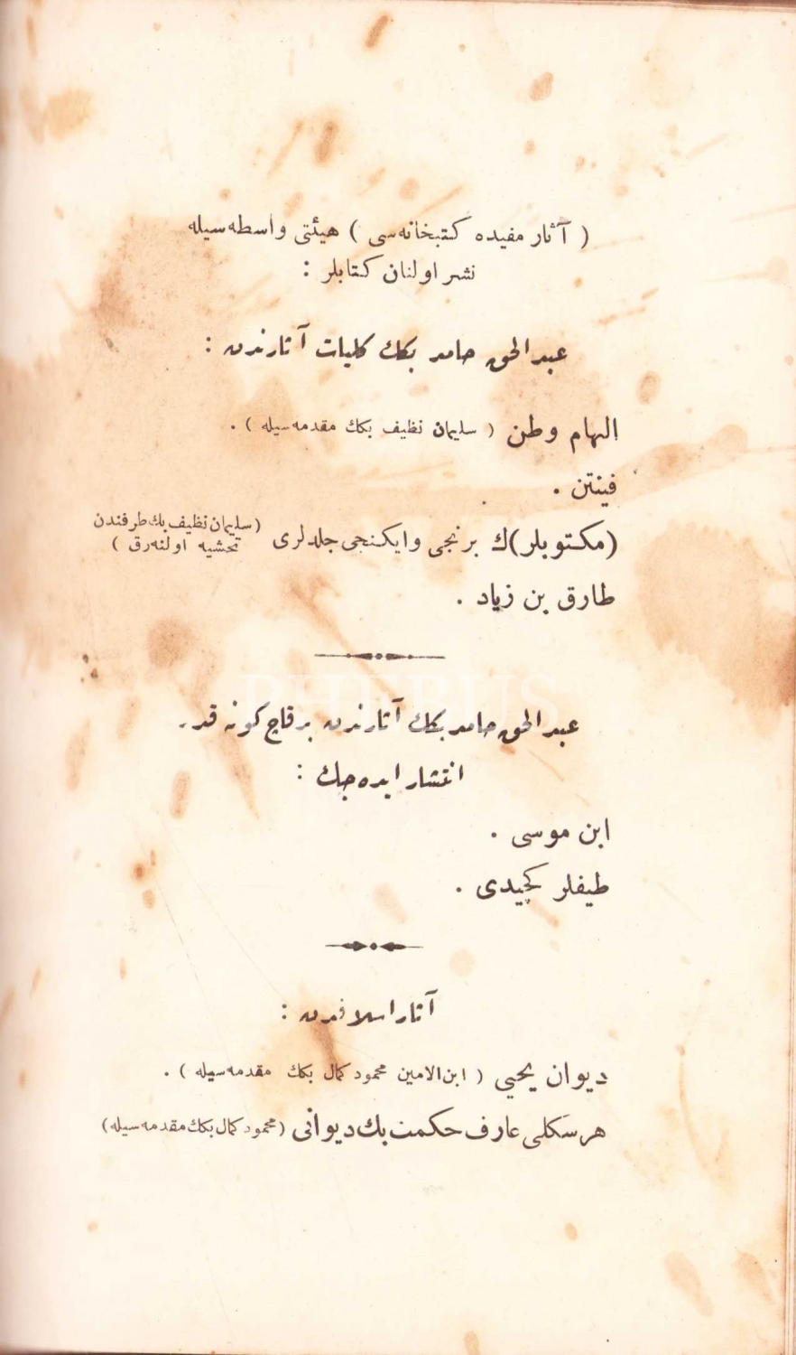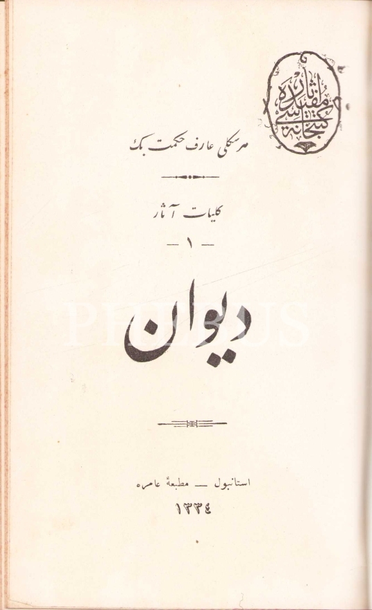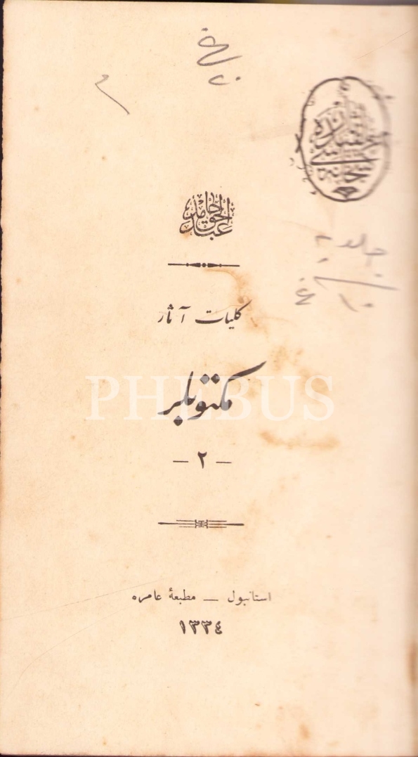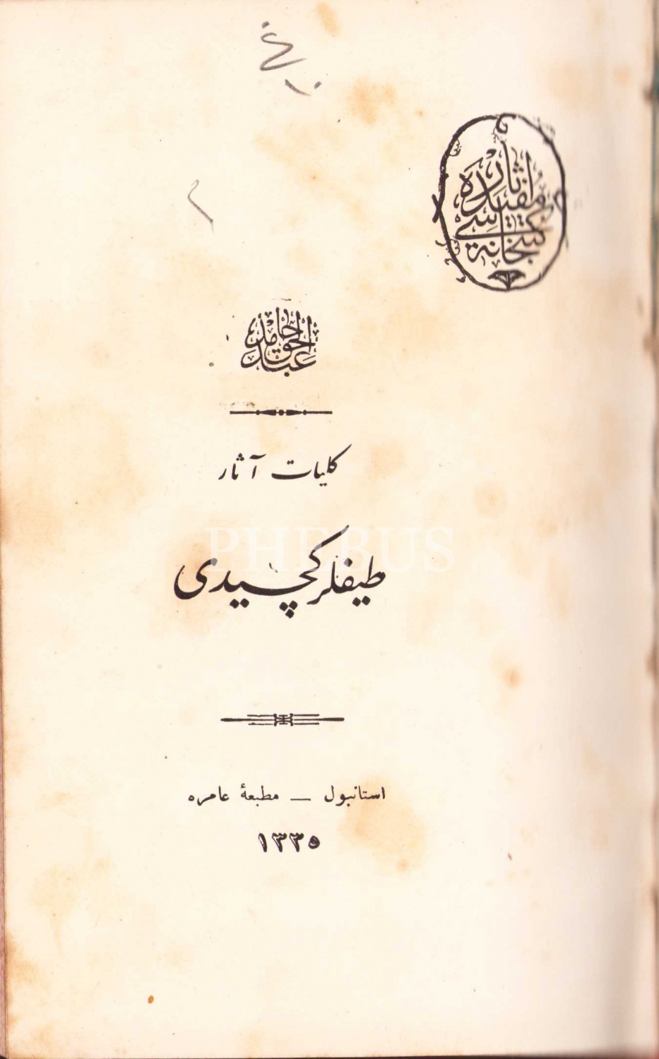 Osmanlıca 4 kitap bir arada: Mektublar 2, Abdülhak Hamid, İstanbul 1334,338 syf.; Tayflar Geçidi, Abdülhak Hamid, İstanbul 1335, 114 syf.; Divan, Leskofçalı Galib Bey, İstanbul 1335, 158 syf.; Divan, Hersekli Arif Hikmet Bey, İstanbul 1334, 296 syf.