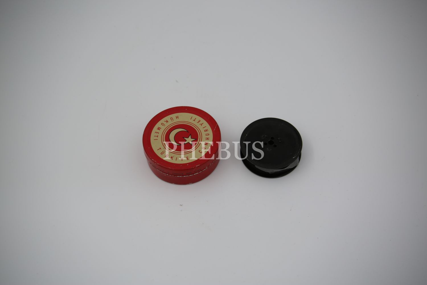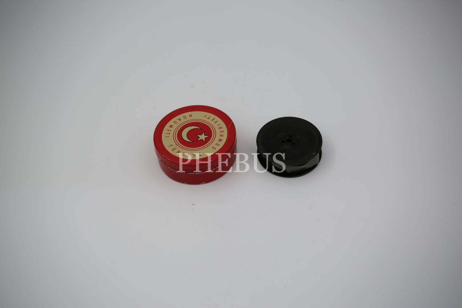Üzeri Türkiye Cumhuriyeti Hükümeti yazılı teneke kutu içinde daktilo şeridi, 7x7x2 cm