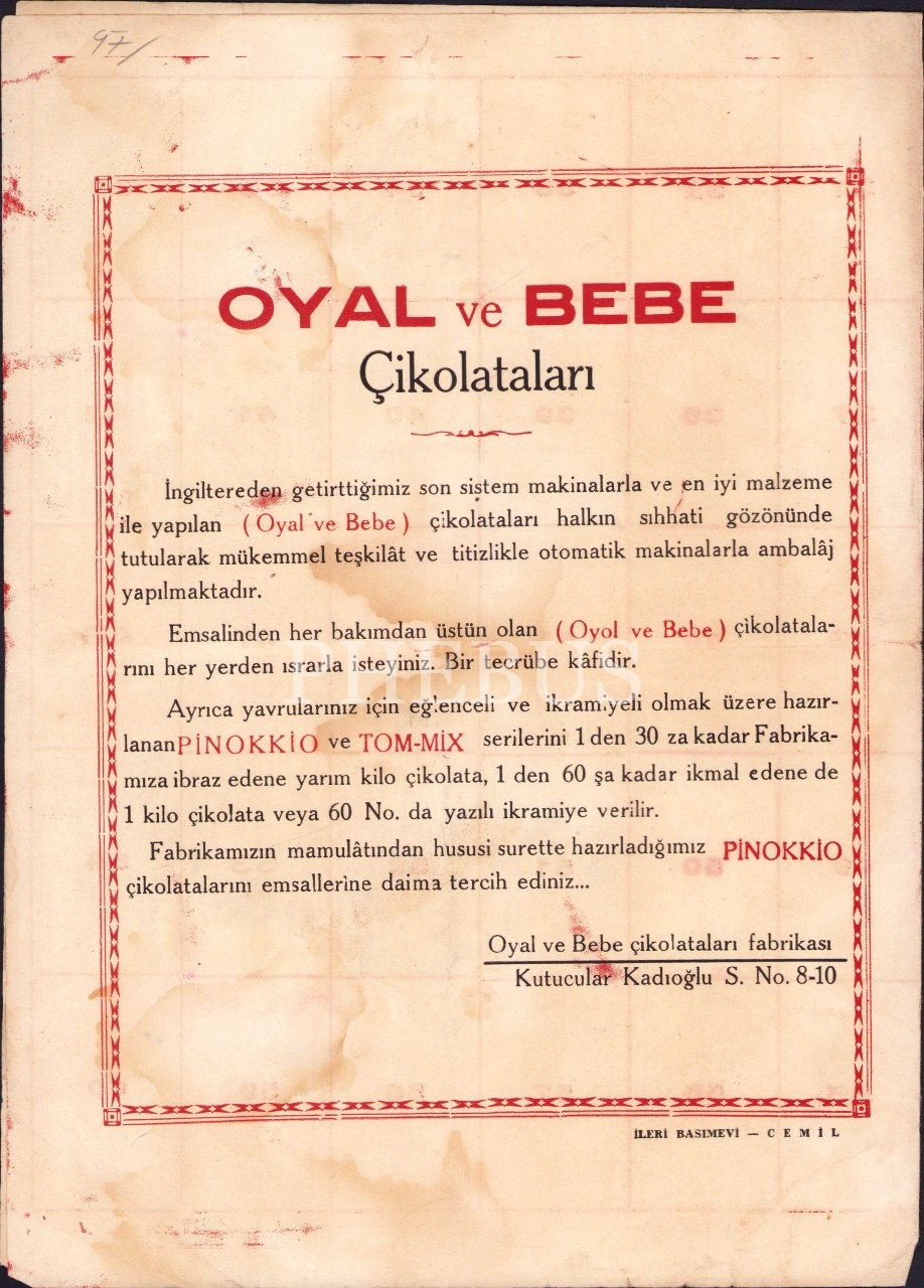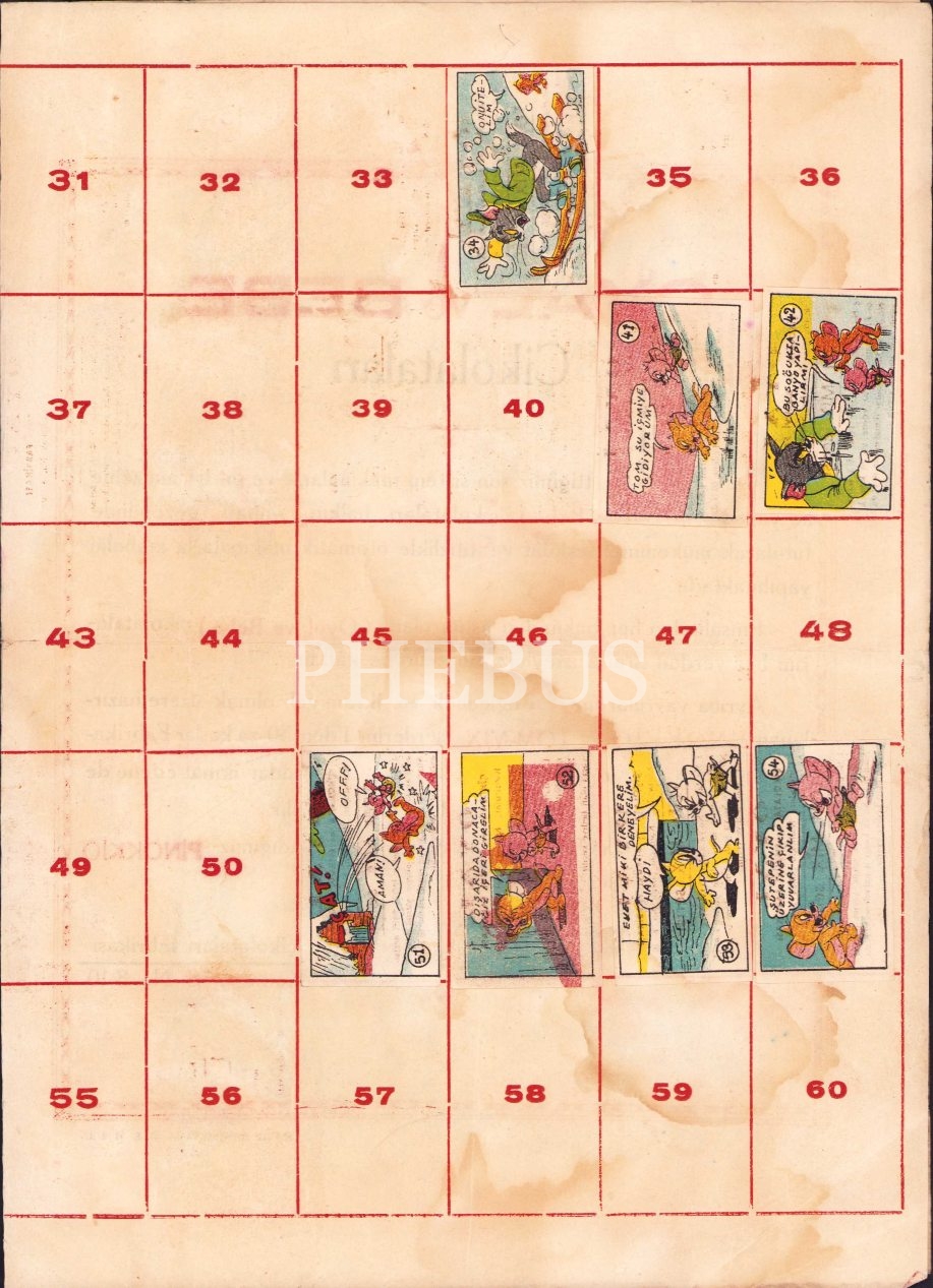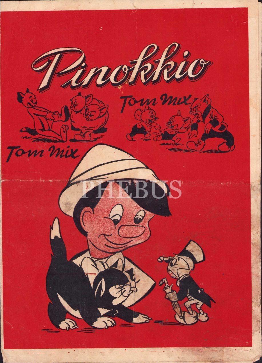 Pinokkio - Tom Mix kapaklı iki sayfalık çıkartma albümü, arkası Oyal ve Bebe Çikolataları reklamlı, 23x32 cm