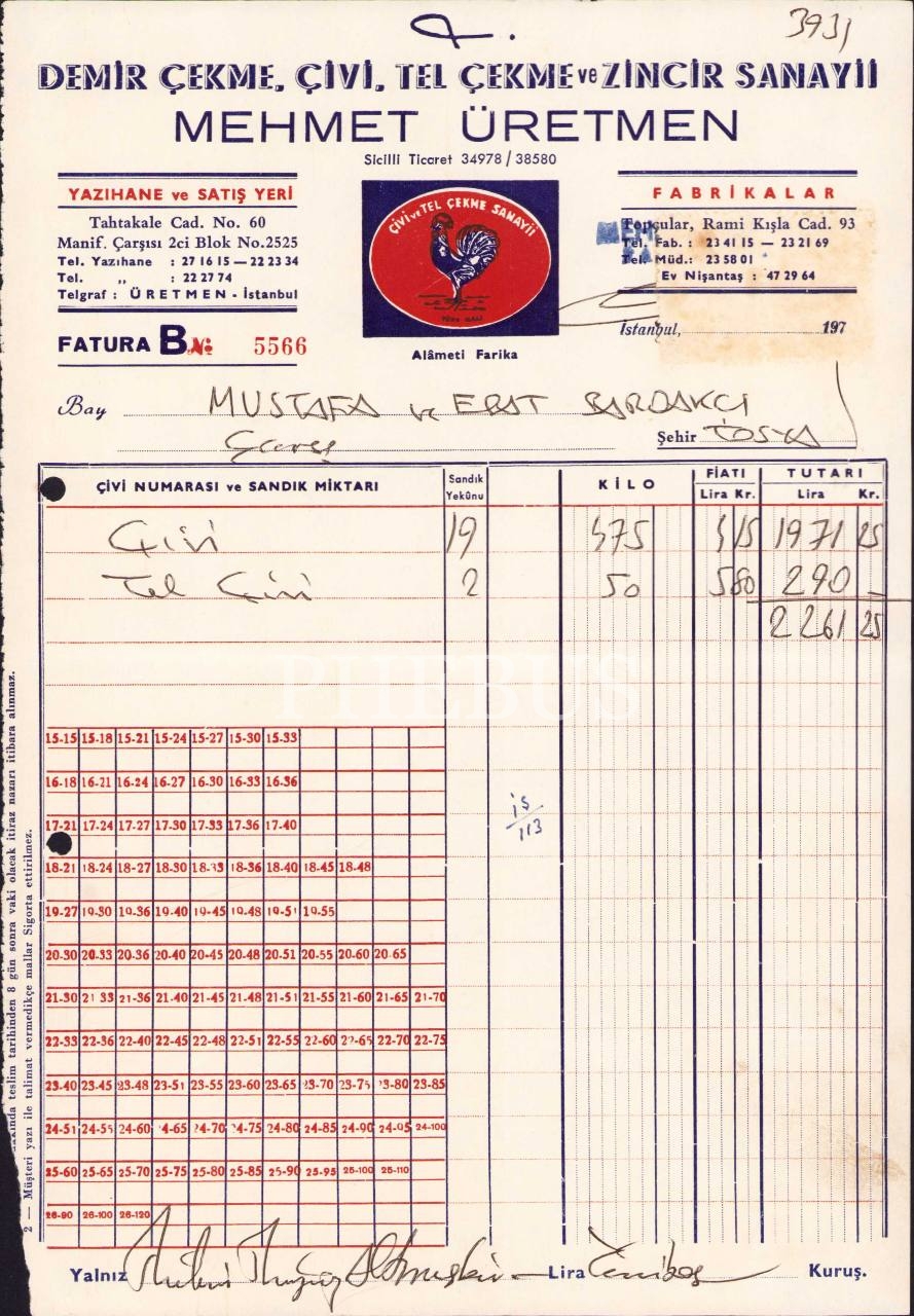 Mehmet Üretmen (Çivi ve Tel Çekme Sanayii) antetli fatura, 21x28 cm