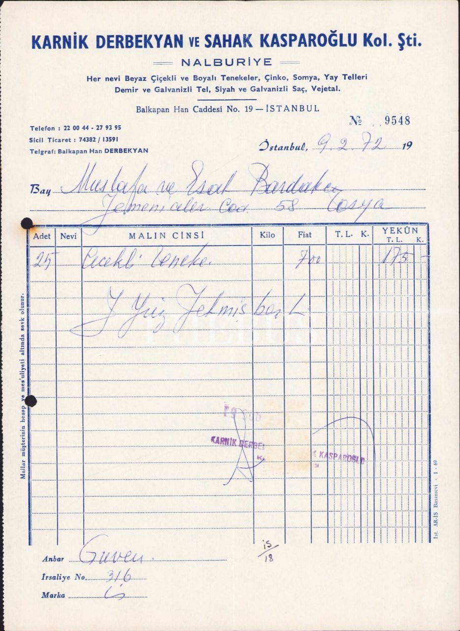 Karnik Derbekyan ve Sahak Kasparoğlu Kol. Şti. (Nalburiye) antetli fatura, 21x28 cm