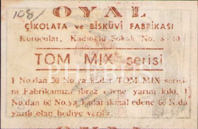Oyal Çikolata ve Bisküvi Fabrikası - Tom Mix Serisi çikolata kartı, 5x3 cm