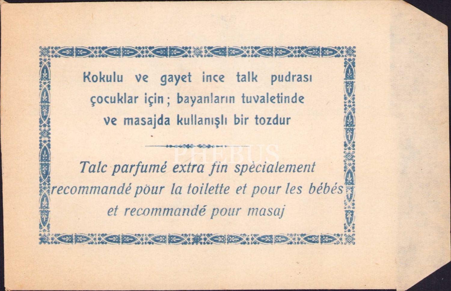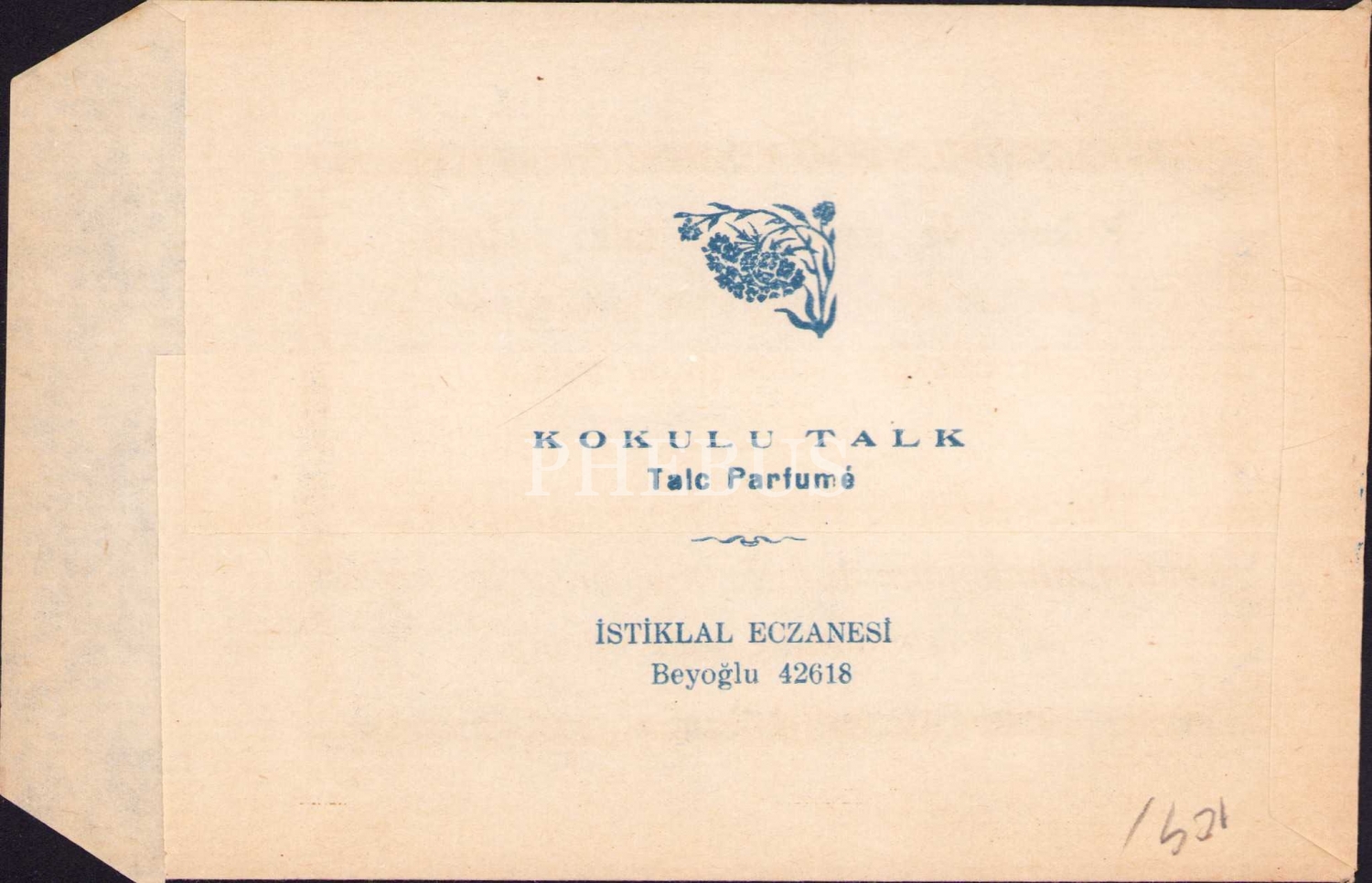 Üzeri Kokulu Talk - İstiklal Eczanesi (Beyoğlu 42618) yazılı Türkçe ve Fransızca yazılı boş reklam zarfı, 17x11 cm