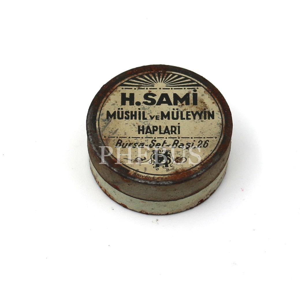 H. Sami Müshil ve Müleyyin Hapları (Bursa Set-Başi) yazılı metal kutu, 3x3x1 cm