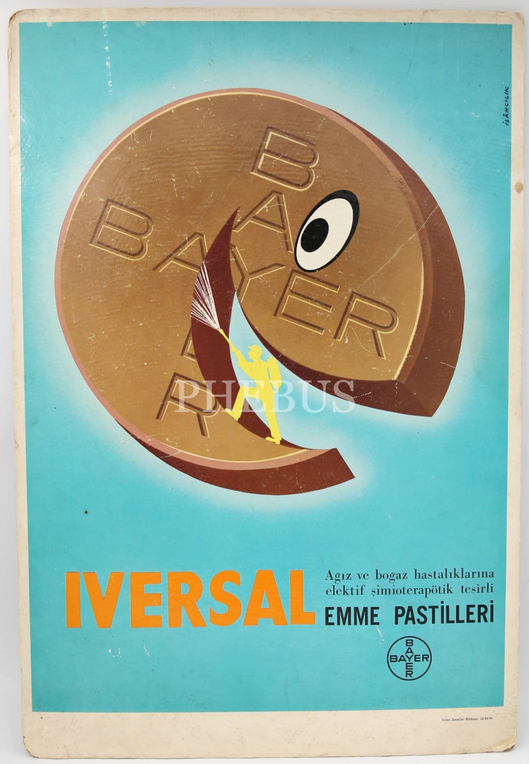 Bayer Iversal emme pastilleri reklam kartoneti, arkası damga ve ilan pullu, 32x48 cm