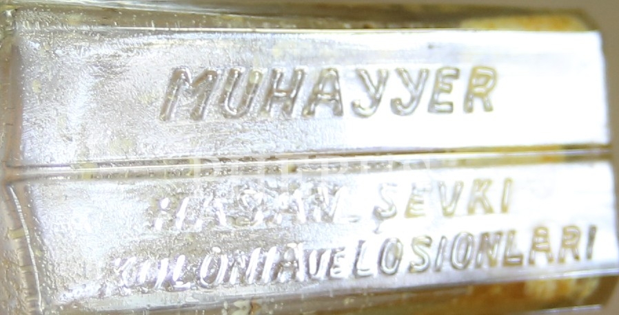 Türkçe ve Fransızca Muhayyer Losyon Hasan Şevki etiketli boş şişe, 5x18x5 cm, etiketi haliyle