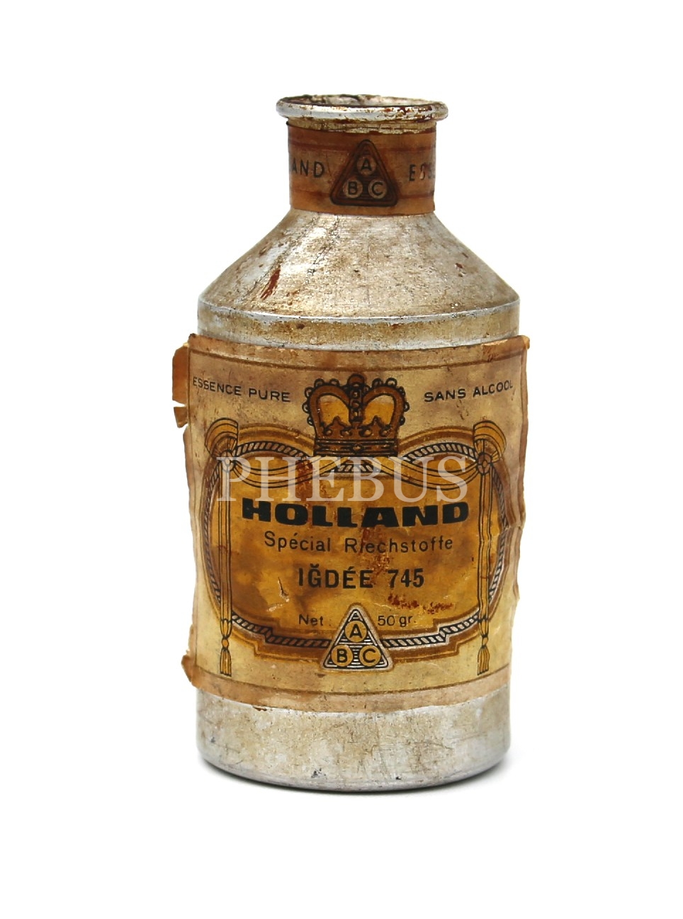 Holland Special Riechstofte İğdee 745 etiketli metal şişe, boş, 4x8 cm, etkiketi yorgun