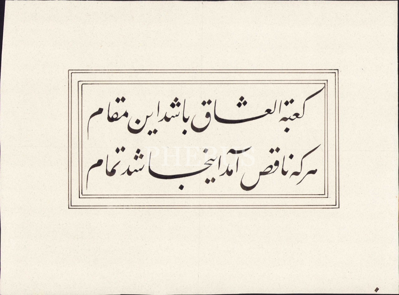 Talik Farsça beyit, "Ka'betü'l-uşşâk bâşed in makâm Her ki nâkıs âmed inca şod temâm" [Aşıkların kâbesi oldu bu makam Her kim ki noksan geldi, oldu tamam], 30x22 cm