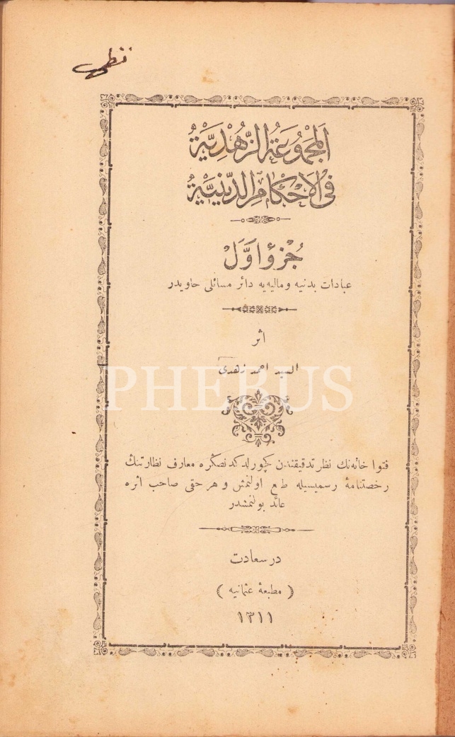 Seyyid Ahmed Zühdi'nin "el-Mecmuatü'z-Zühdiyye fi'l-Ahkâmi'd-Dîniyye" isimli eseri , Matbaa-i Osmaniye, sene 1311, 115 sayfa, 15x23 cm, sırtı haliyle