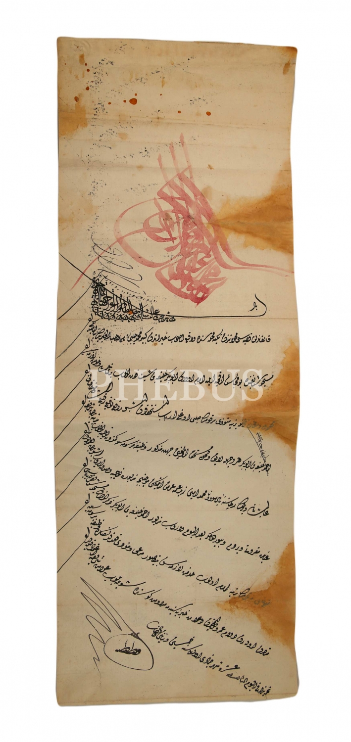 Sultan İkinci Mahmud el çekme tuğralı, Kalkandelen-Makedonya'da bir camide imamlık görevlendirmesine dair vazife beratı, 1250, tamirli, 23x65 cm