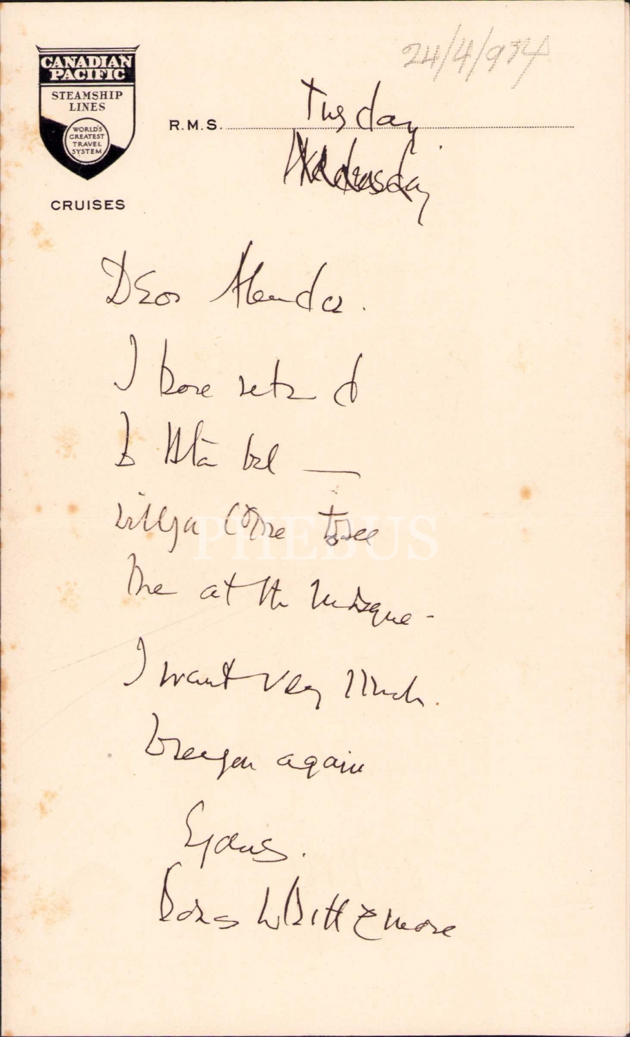 Canadian Pacific antetli yemek menüsü, 1934, 12x20 cm