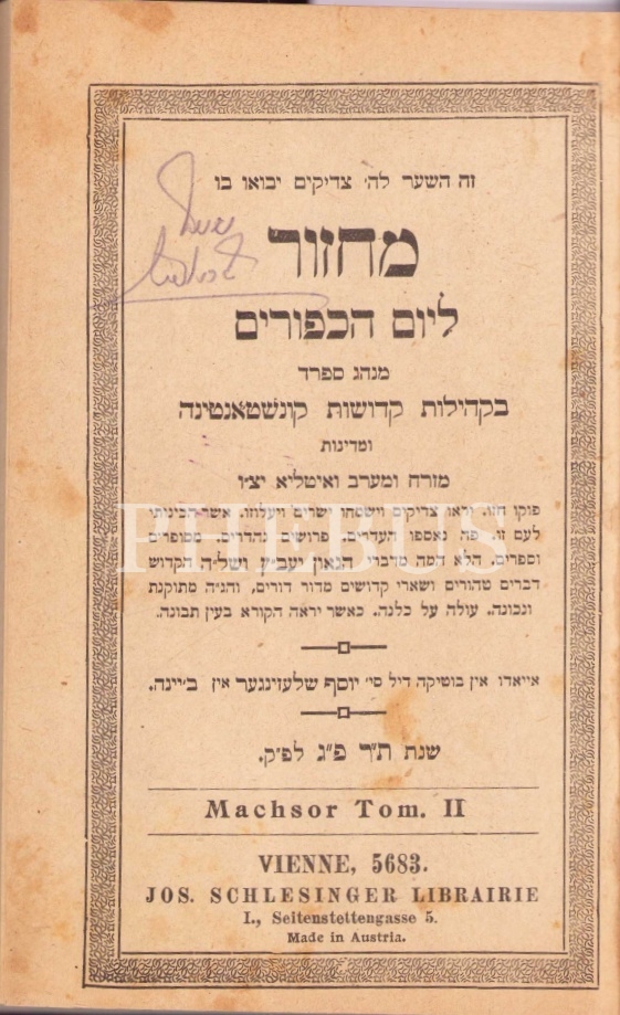İbranice Kipur, Jak Sağız, Viyana baskı, 169 sayfa, 12x19 cm