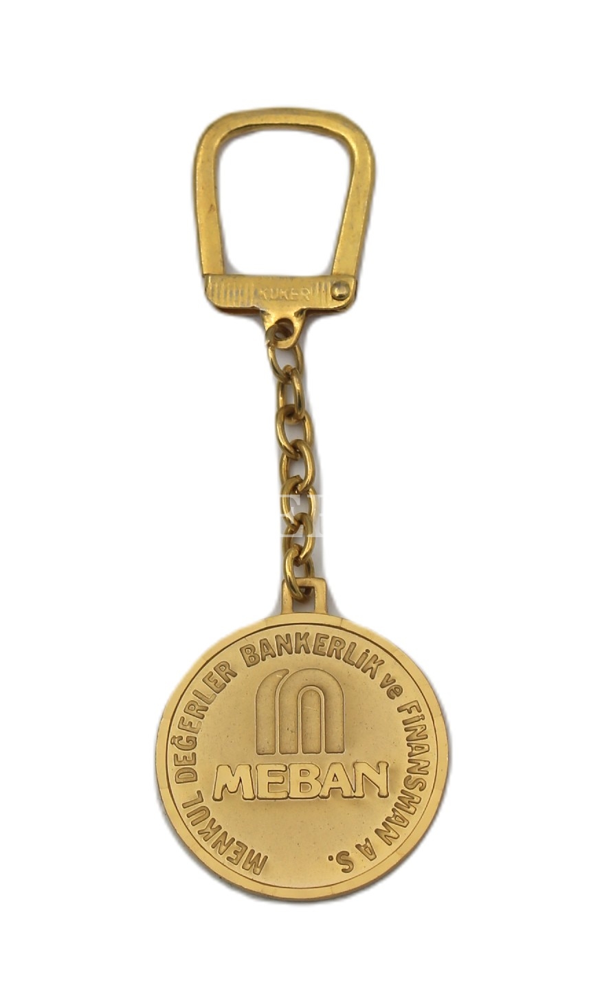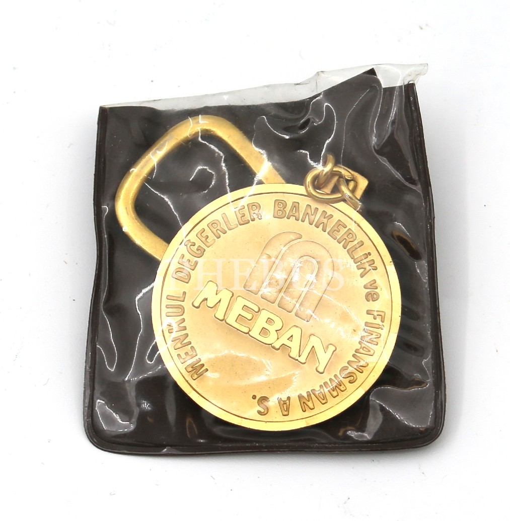 Meban - Menkul Değerler Bankerlik ve Finansman A.Ş. yazılı anahtarlık, kılıfı ile birlikte, çap 3 cm