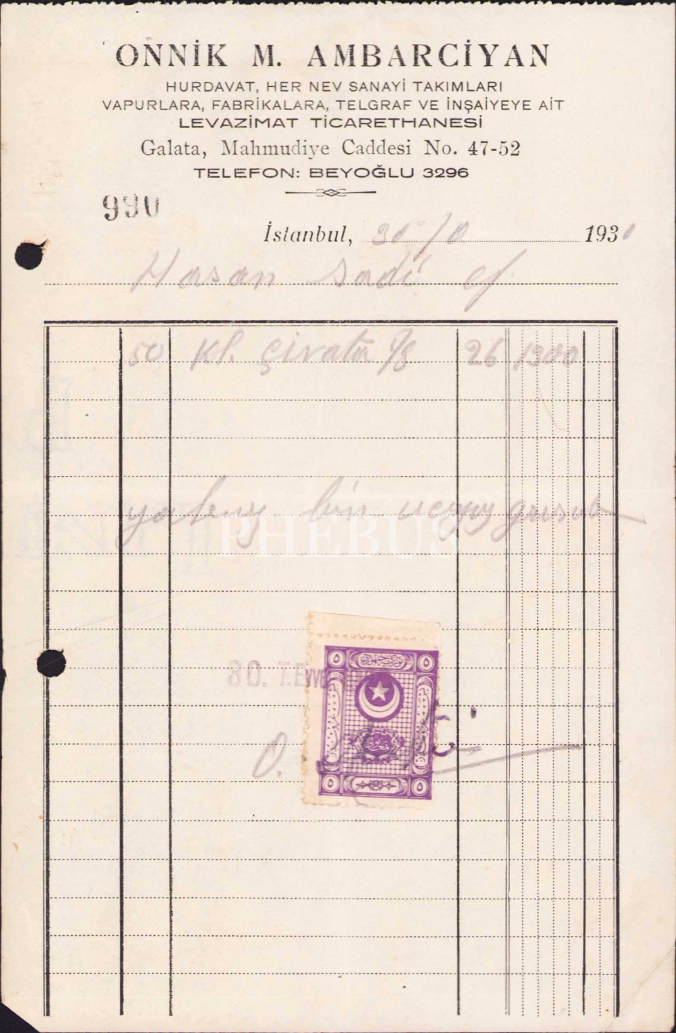 Onnik M. Ambarciyan Levazimat Ticarethanesi antetli fatura, İstanbul 1930, 13x20 cm