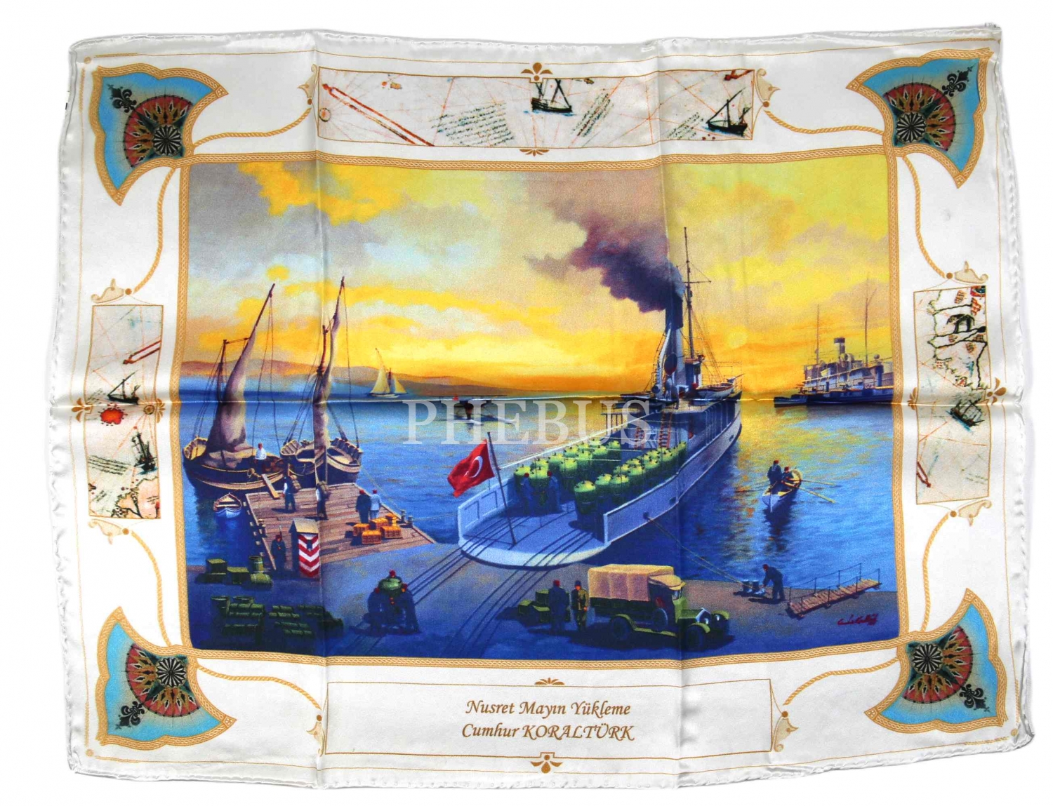 Nusret Mayın Yükleme temalı ipek mendil, Cumhur Koraltürk imzalı, Deniz Müzesi, 20x26 cm